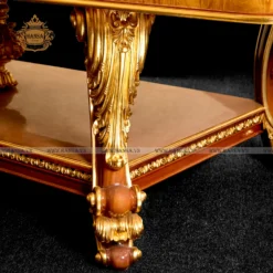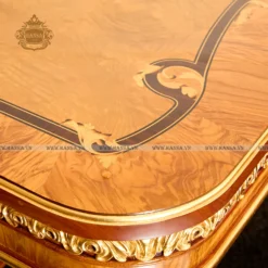 Mặt bàn thu hút mọi ánh nhìn với kỹ thuật khảm gỗ (inlay) thủ công tinh xảo. Sự kết hợp hài hòa giữa các loại vân gỗ tự nhiên, sắp xếp thành họa tiết đối xứng đẹp mắt, tạo nên một bức tranh hoàn hảo dưới ánh đèn. Đường viền và toàn bộ khung chân bàn thể hiện rõ tinh thần Tân Cổ Điển lộng lẫy qua những chi tiết chạm khắc hoa văn cẩn thận, mạ vàng sáng bóng.