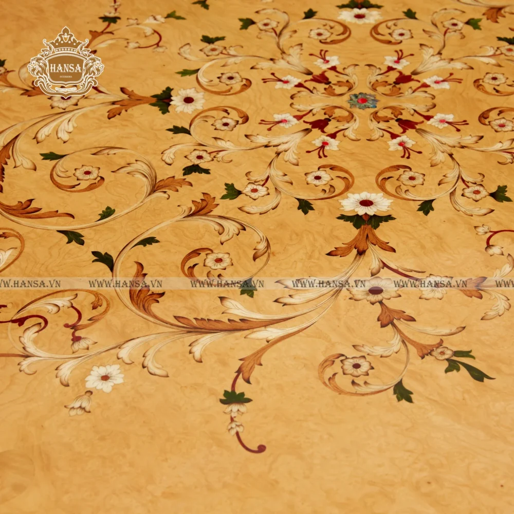 Điểm nhấn thu hút nhất chính là mặt bàn lớn được trang trí bằng kỹ thuật cẩn hoa văn (Marquetry) vô cùng tinh xảo. Những họa tiết hoa lá đối xứng được ghép nối tỉ mỉ từ nhiều loại gỗ quý, tạo nên một “bức họa” thiên nhiên sống động trên bề mặt gỗ bóng gương. Phía dưới, chân trụ vững chãi được chạm trổ họa tiết lá tây uốn lượn và phủ lớp dát vàng lộng lẫy, phản chiếu ánh sáng lung linh, tạo nên sức hút khó cưỡng cho mọi vị khách khi bước vào phòng.