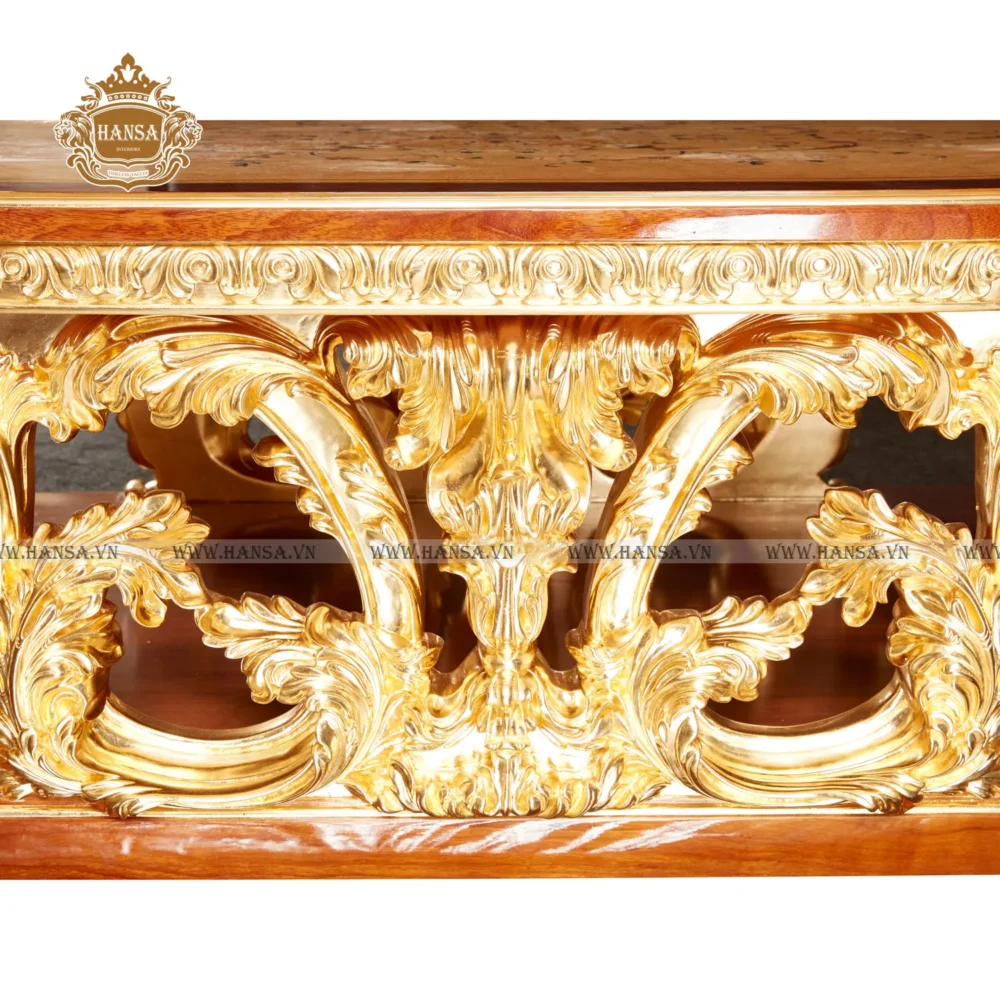 Mặt bàn lớn được trang trí bằng kỹ thuật cẩn hoa văn (Marquetry) vô cùng tinh xảo. Những họa tiết hoa lá đối xứng được ghép nối tỉ mỉ từ nhiều loại gỗ quý, tạo nên một “bức họa” thiên nhiên sống động trên bề mặt gỗ bóng gương. Phía dưới, chân trụ vững chãi được chạm trổ họa tiết lá tây uốn lượn và phủ lớp dát vàng lộng lẫy, phản chiếu ánh sáng lung linh, tạo nên sức hút khó cưỡng cho mọi vị khách khi bước vào phòng.