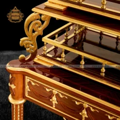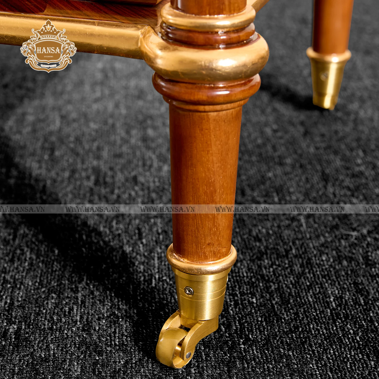 Sản phẩm được chế tác từ những vật liệu cao cấp nhất. Thân bàn sử dụng loại gỗ tự nhiên quý hiếm với vân gỗ lộng lẫy, được phủ lớp sơn bóng bẩy tạo chiều sâu. Điểm nhấn tinh xảo nằm ở các chi tiết chạm khắc và lớp dát vàng thủ công dọc theo khung viền và tay vịn, tôn lên vẻ xa hoa, lộng lẫy.