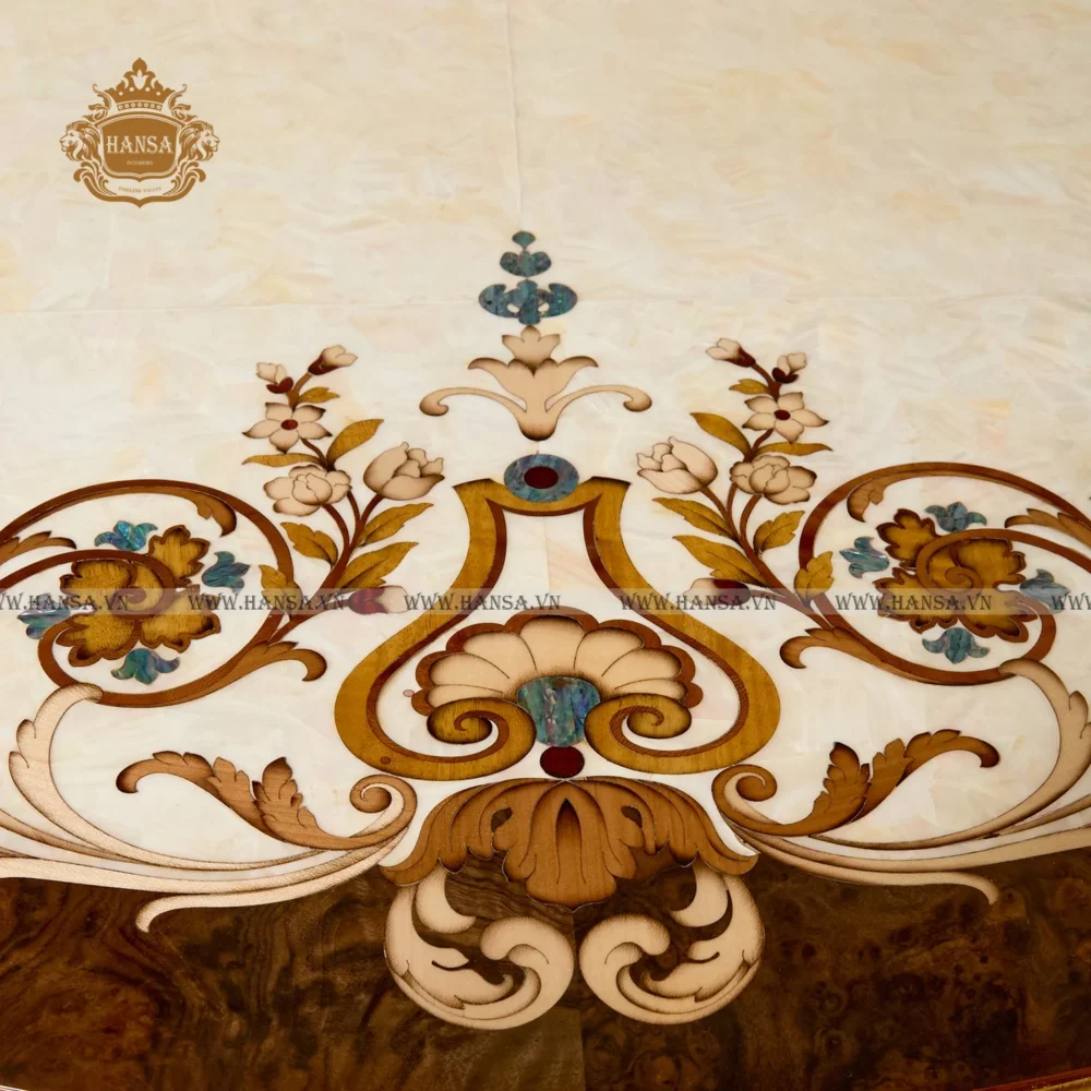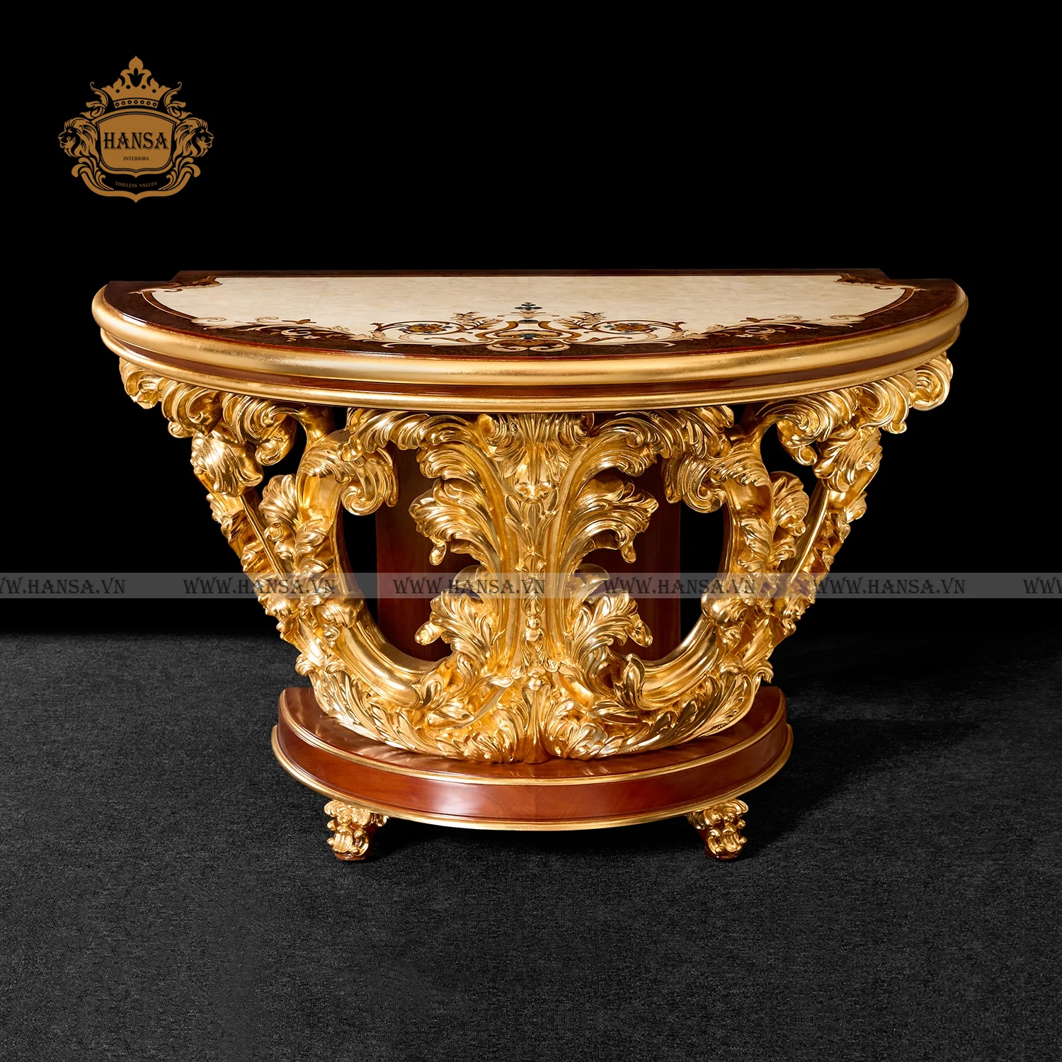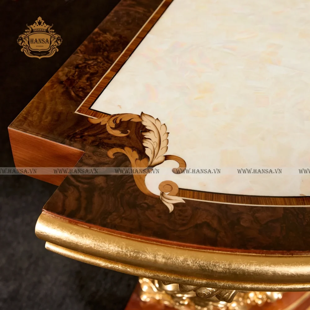 Mặt bàn là sự kết hợp tinh tế giữa veneer gỗ óc chó hoặc gỗ burl (gỗ nu) cao cấp viền ngoài và một tấm đá tự nhiên hoặc khảm trai lấp lánh ở trung tâm. Sự kết hợp vật liệu này không chỉ tôn lên vẻ xa hoa mà còn đảm bảo độ bền và dễ dàng vệ sinh. Đặt chiếc bàn console này tại sảnh chính, phòng khách hay hành lang sẽ ngay lập tức nâng tầm không gian, khẳng định gu thẩm mỹ tinh tế và vị thế của gia chủ. Đây chính là lựa chọn hoàn hảo cho kiến trúc hoàng gia và tân cổ điển.