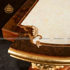 Toàn bộ khung bàn được làm từ loại gỗ gõ đỏ tự nhiên quý hiếm, nổi tiếng với độ bền vượt trội, khả năng chống mối mọt tuyệt đối và màu sắc vân gỗ ấm áp, độc đáo. Phần thân bàn gây ấn tượng mạnh mẽ với các chi tiết chạm khắc thủ công tinh xảo hình lá acanthe cuộn xoắn, biểu tượng của sự phồn thịnh. Các đường nét chạm trổ này sau đó được phủ lớp vàng cao cấp, tạo nên sự tương phản ánh kim rực rỡ trên nền gỗ gõ đỏ trầm lắng.