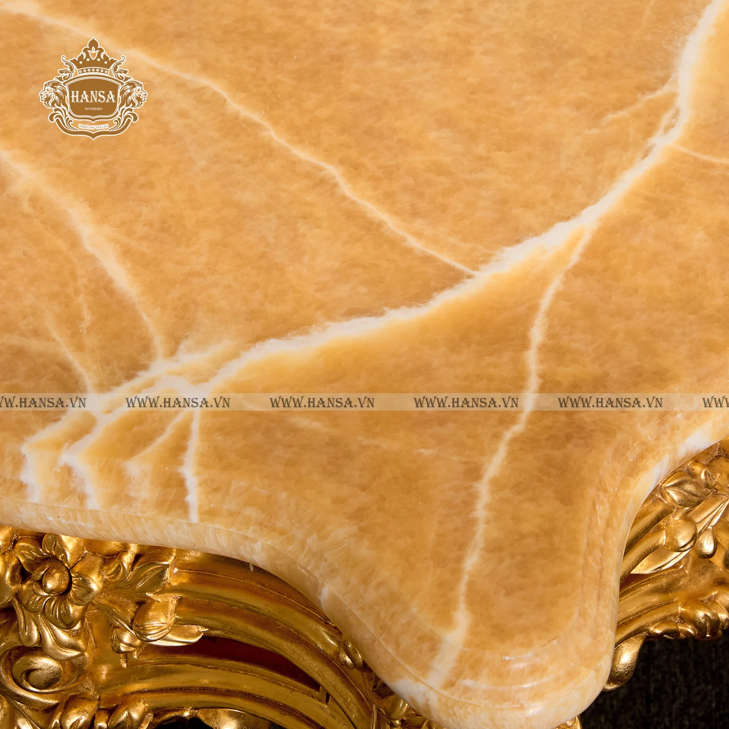 Chiếc đôn này là sự kết hợp hài hòa giữa sự xa hoa của chất liệu và sự tinh tế của kỹ thuật chế tác thủ công. Mặt đôn được làm từ đá tự nhiên cao cấp, có thể là đá onyx hoặc đá marble, với những đường vân độc đáo màu vàng kem hoặc nâu hổ phách. Bề mặt đá bóng loáng, không chỉ mang lại vẻ đẹp độc nhất vô nhị mà còn thể hiện sự mát mẻ và sang trọng vượt trội.