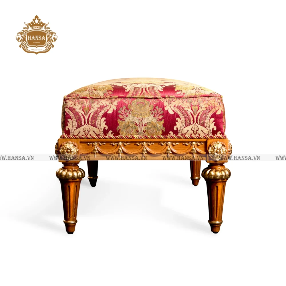 Khung đôn được chế tác từ gỗ tự nhiên bền bỉ, nổi bật với các đường chạm khắc hoa văn dây leo tinh xảo. Các chân ghế tiện tròn kiểu classic được điểm xuyết bằng vàng kim, tạo nên vẻ ngoài lộng lẫy như kiến trúc cung điện pháp. Bề mặt đôn được bọc lớp vải jacquard hoặc thổ cẩm cao cấp, với họa tiết damask màu đỏ đô và vàng kim nổi bật. Chất liệu vải mềm mại, dày dặn mang lại cảm giác thoải mái tối đa và khẳng định đẳng cấp thượng lưu của gia chủ.