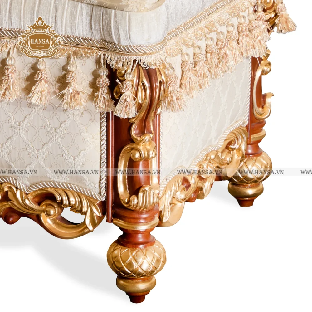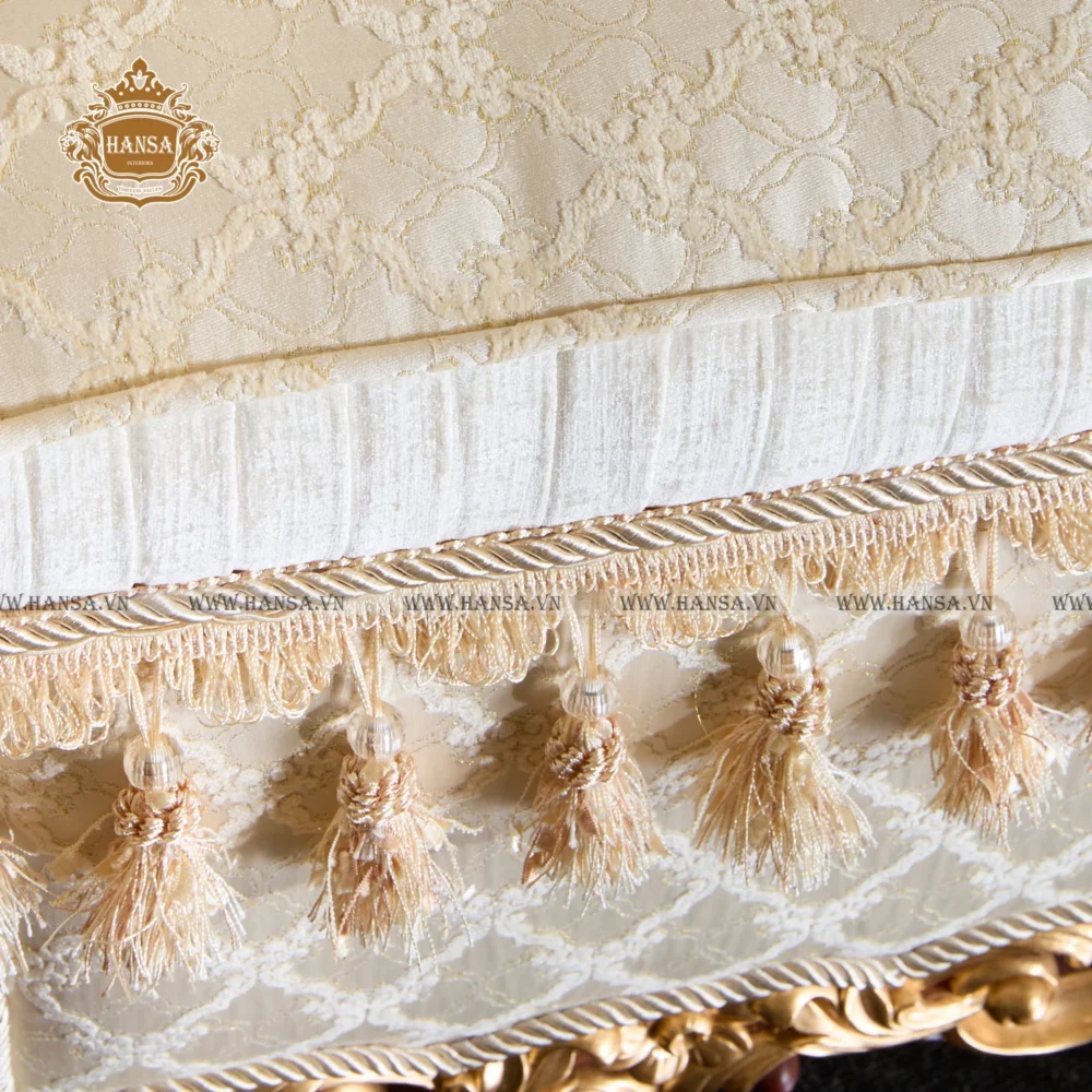 Với phần khung được chế tác từ gỗ quý, từng đường nét chạm khắc cầu kỳ, tỉ mỉ đã được phủ một lớp vàng óng ánh, mang lại vẻ ngoài hoàng gia và vô cùng sang trọng. Điểm nhấn tinh tế tiếp theo chính là lớp bọc ngoài. Vải cao cấp với họa tiết gấm hoặc thổ cẩm tinh xảo, thường là tông màu kem, be hoặc vàng nhạt, tạo cảm giác mềm mại và quý phái. Đặc biệt, chi tiết tua rua và dây xoắn trang trí ở viền đệm càng làm tăng thêm sự cầu kỳ, gợi nhớ đến những món đồ nội thất xa hoa của giới quý tộc châu Âu xưa.