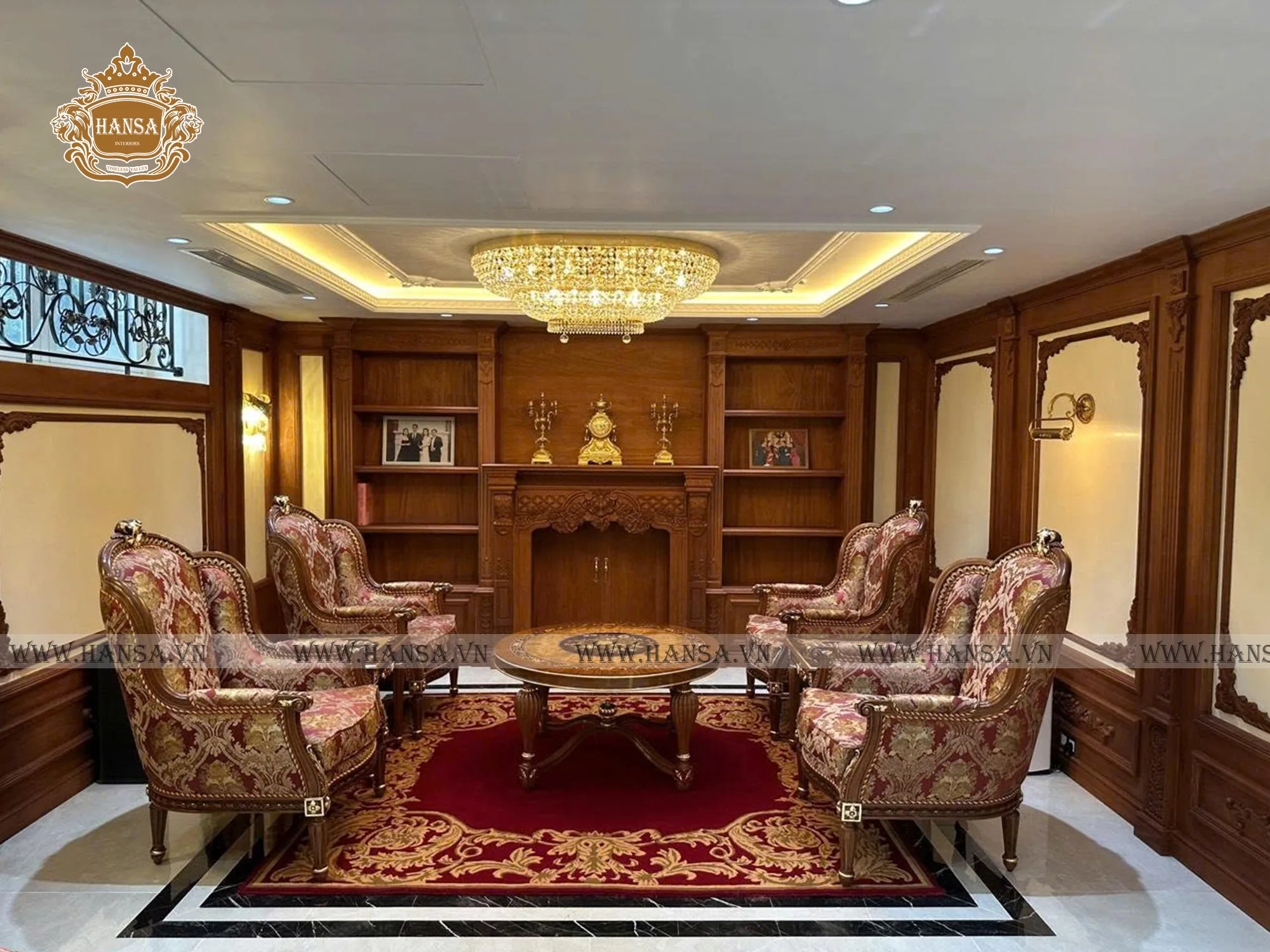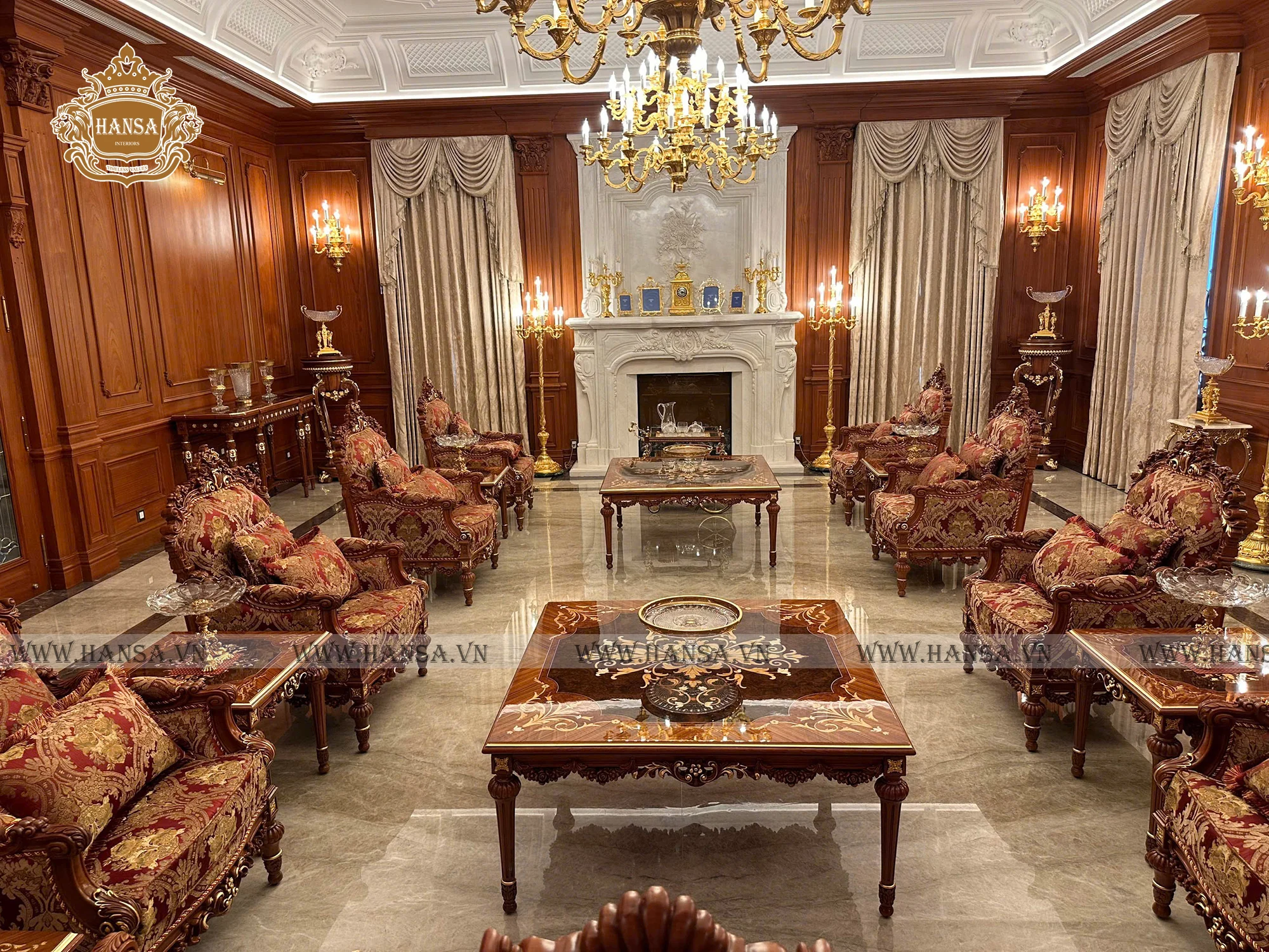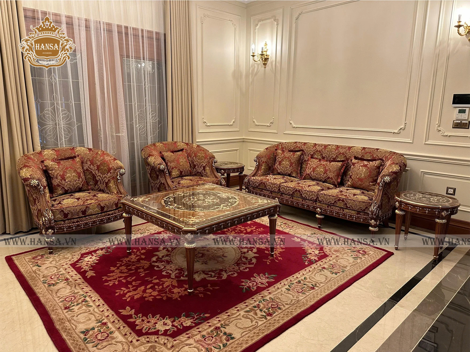 Hansa Luxury Interior kiến tạo không gian phòng khách và phòng ăn mang phong cách cổ điển Ý, thể hiện trọn vẹn tinh thần sang trọng, quyền quý và đậm chất nghệ thuật châu Âu. Toàn bộ nội thất được chế tác thủ công từ gỗ gõ đỏ tự nhiên cao cấp, với hoa văn chạm khắc tinh xảo, đường nét mềm mại và tỉ lệ hài hòa chuẩn mực cổ điển. Kết hợp cùng vải bọc nhập khẩu trực tiếp từ Ý, từng bộ sofa, ghế ăn và rèm cửa trở thành điểm nhấn tinh tế, mang đến cảm giác êm ái, đẳng cấp và đầy cuốn hút.