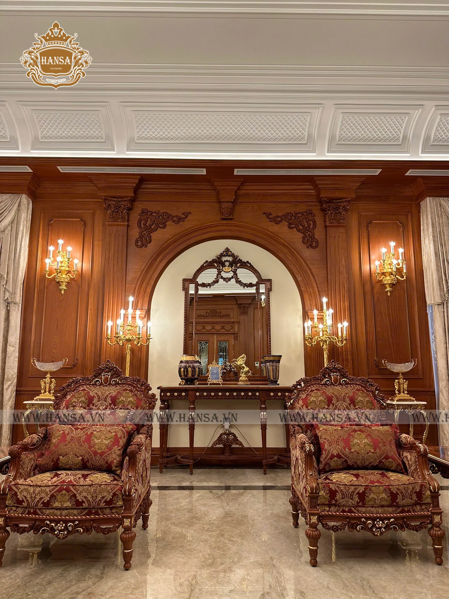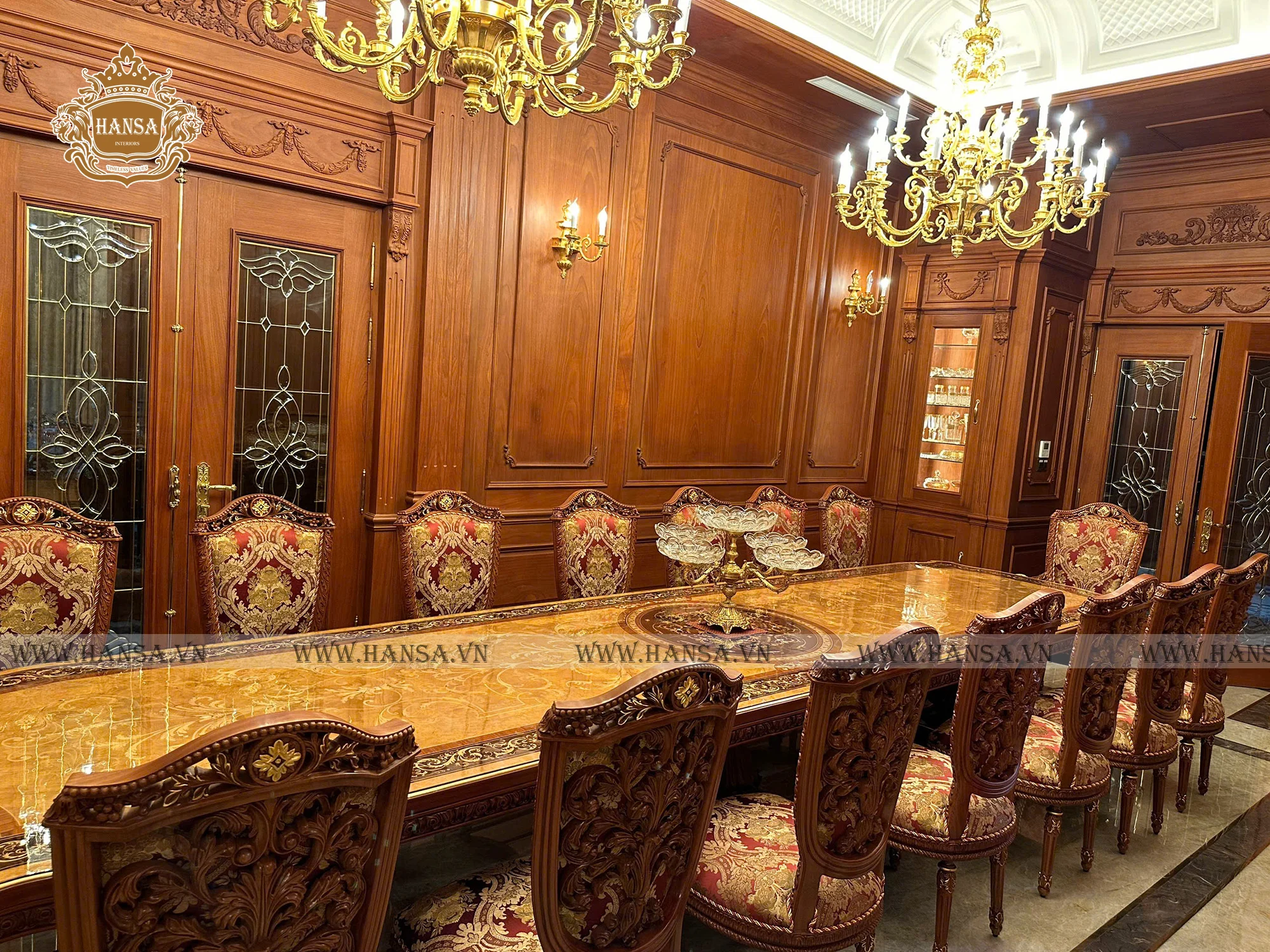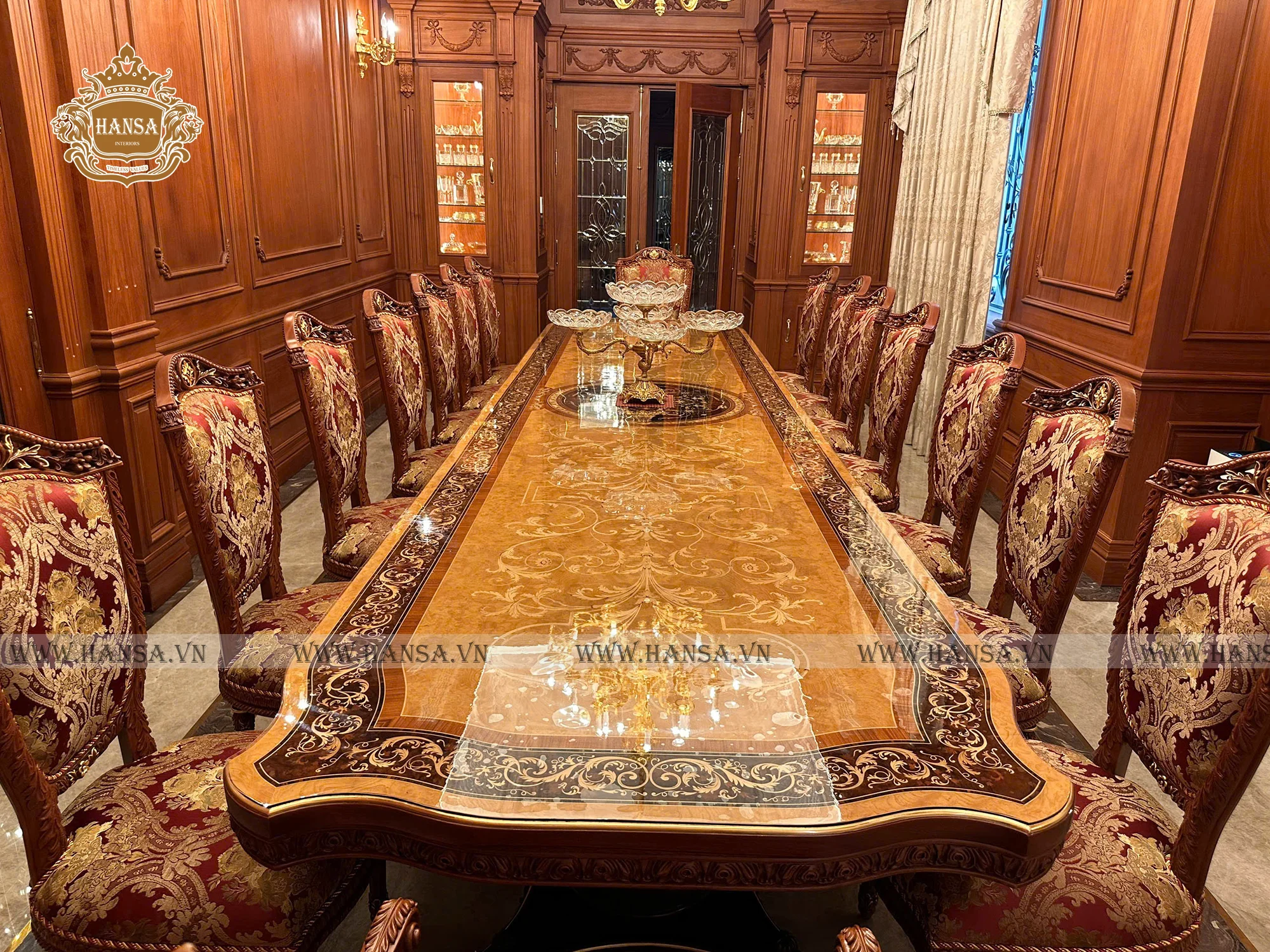 Hansa Luxury Interior kiến tạo không gian phòng khách và phòng ăn mang phong cách cổ điển Ý, thể hiện trọn vẹn tinh thần sang trọng, quyền quý và đậm chất nghệ thuật châu Âu. Toàn bộ nội thất được chế tác thủ công từ gỗ gõ đỏ tự nhiên cao cấp, với hoa văn chạm khắc tinh xảo, đường nét mềm mại và tỉ lệ hài hòa chuẩn mực cổ điển. Kết hợp cùng vải bọc nhập khẩu trực tiếp từ Ý, từng bộ sofa, ghế ăn và rèm cửa trở thành điểm nhấn tinh tế, mang đến cảm giác êm ái, đẳng cấp và đầy cuốn hút.