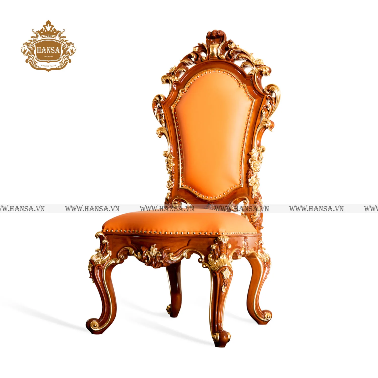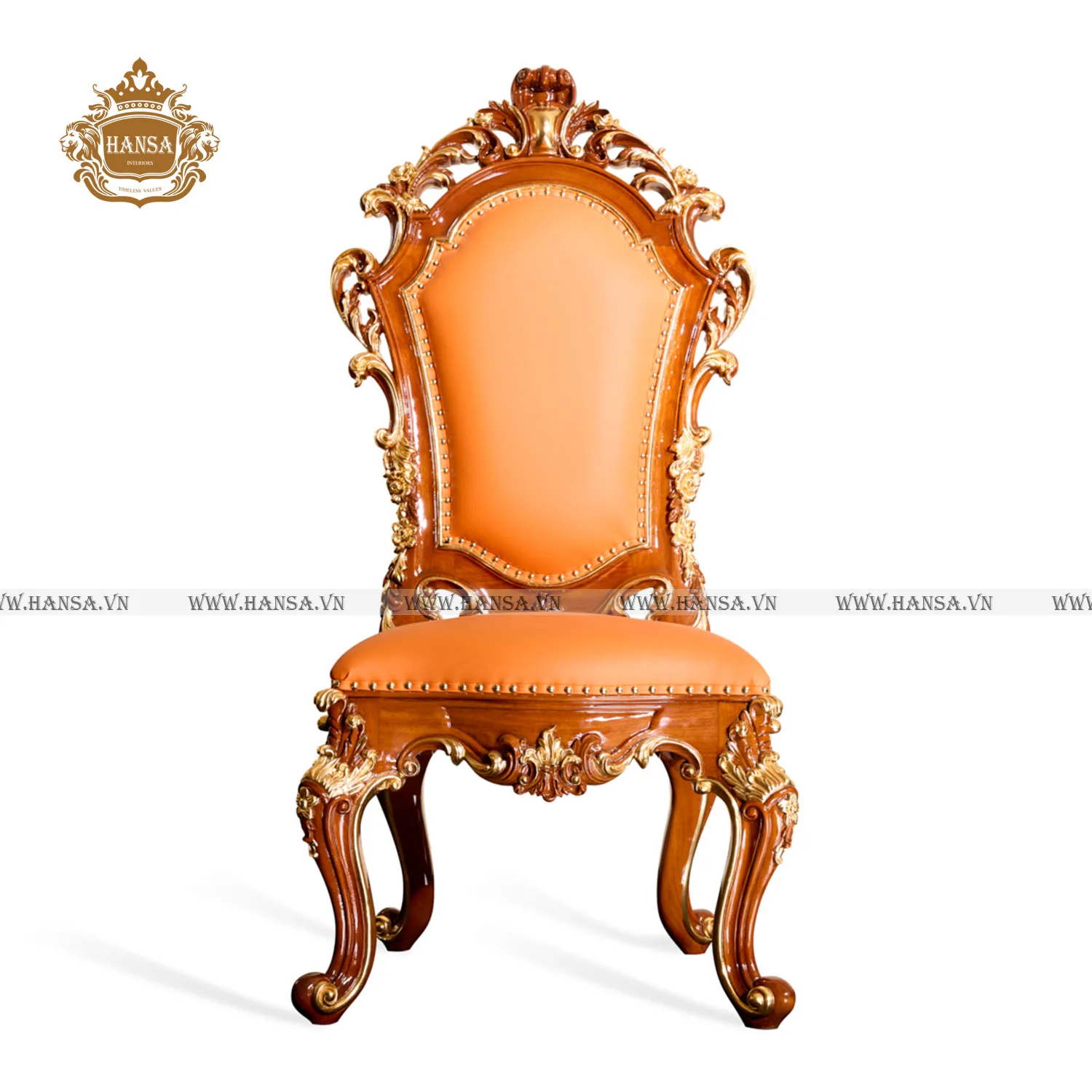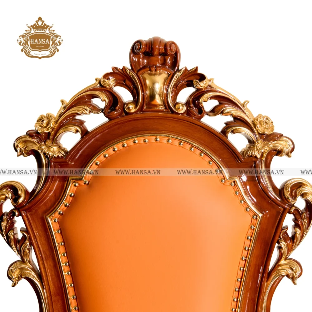 Điểm nhấn đắt giá nhất nằm ở những đường nét chạm trổ hoa văn lá tây uốn lượn mềm mại trên khung gỗ tự nhiên. Từng chi tiết nhỏ đều được điểm xuyết bằng lớp nhũ vàng óng ánh, tạo nên hiệu ứng thị giác rực rỡ dưới ánh đèn chùm. Sự kết hợp hoàn hảo giữa tông gỗ trầm ấm và lớp da bọc màu cam cao cấp không chỉ mang lại vẻ tươi mới, nổi bật mà còn khẳng định gu thẩm mỹ độc đáo của gia chủ.