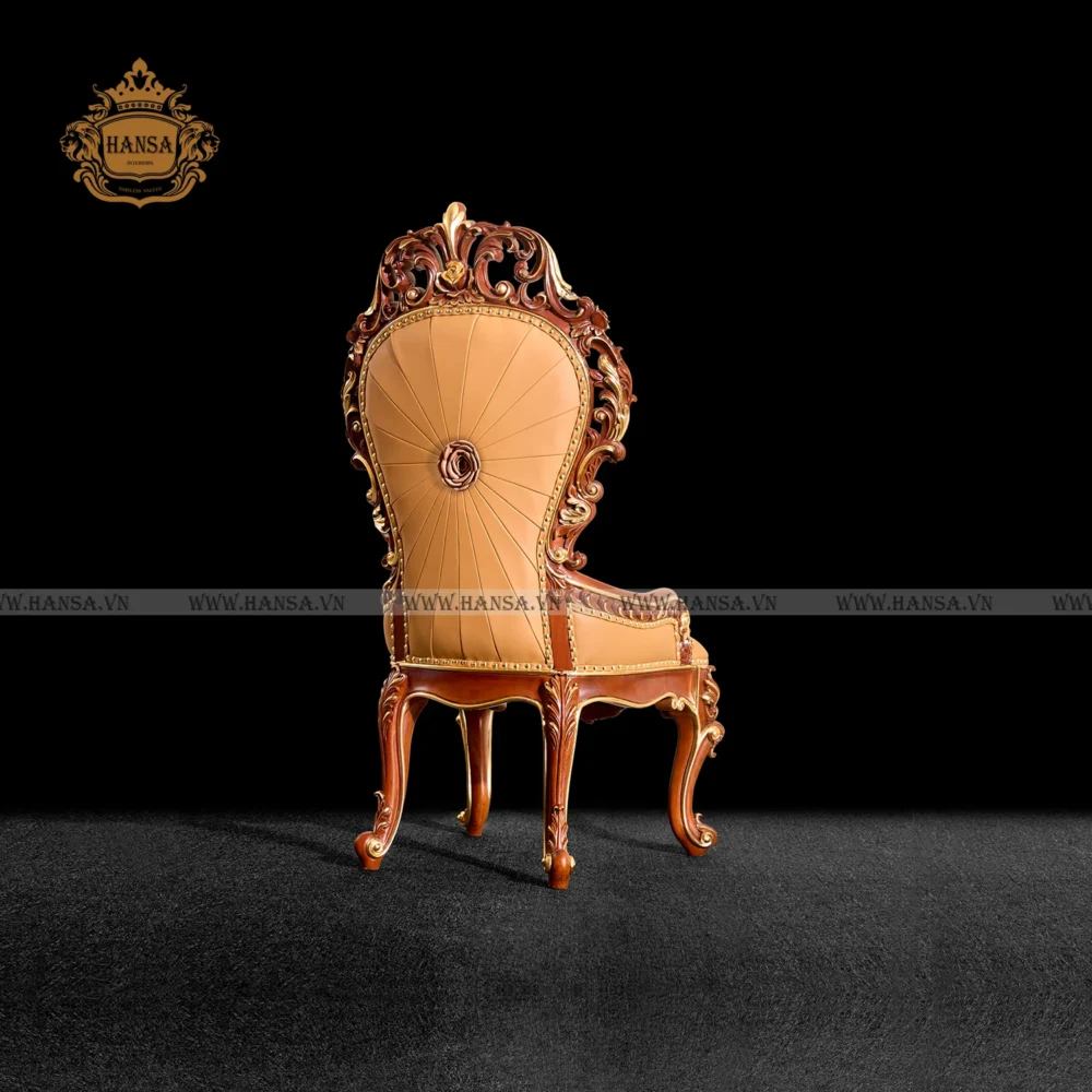 Khung ghế được chế tác tỉ mỉ từ loại gỗ tự nhiên, với màu nâu trầm ấm áp. các đường chạm khắc hoa văn tinh xảo chạy dọc lưng ghế, tay vịn và chân ghế, sau đó được điểm xuyết bằng lớp mạ vàng lộng lẫy, làm nổi bật sự quyền quý và vương giả. lưng ghế cao, uốn cong theo hình dáng cơ thể, mang lại sự hỗ trợ tối đa.
