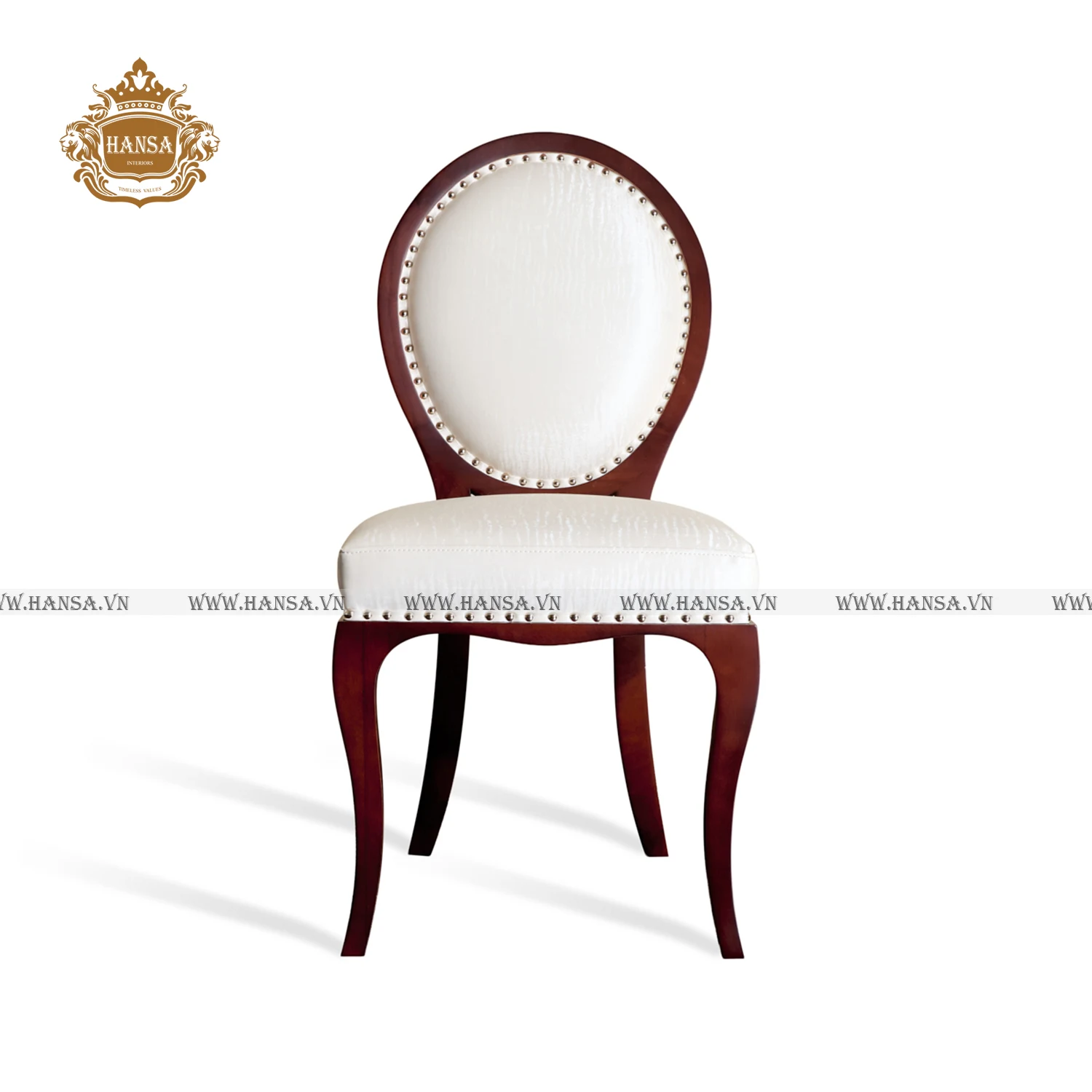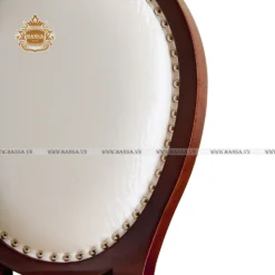 Đặc điểm nổi bật nhất là lưng ghế hình bầu dục (oval), được bao bọc bởi khung gỗ màu nâu đậm (dark wood) với các đường cong nhẹ nhàng, mang lại cảm giác mềm mại hơn hẳn so với các thiết kế góc cạnh. Mặc dù không có chạm khắc vàng cầu kỳ như các mẫu hoàng gia, chiếc ghế vẫn giữ được sự quý phái nhờ chi tiết đính đinh đồng (nailhead trim) chạy dọc theo mép nệm ngồi và lưng ghế.