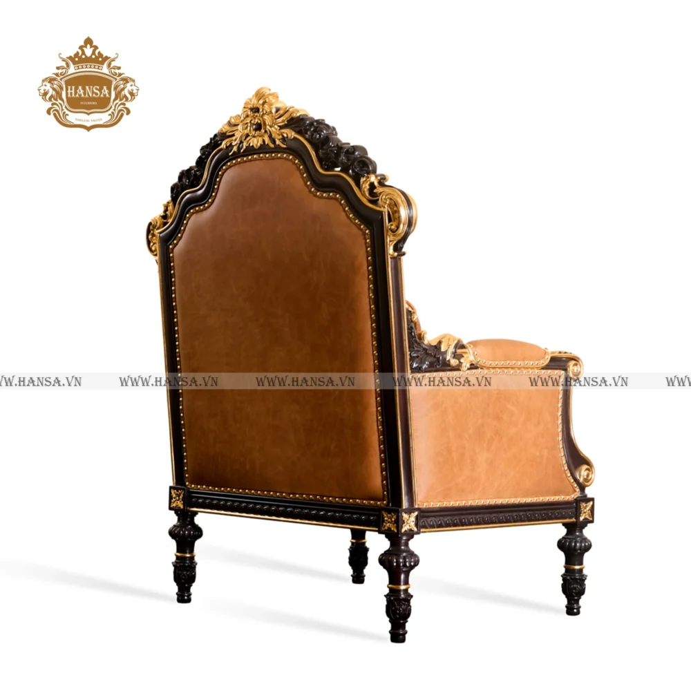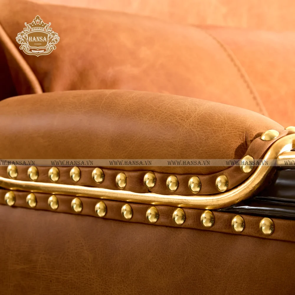 Khung ghế thường được làm từ gỗ gõ đỏ, với các đường nét chạm khắc tinh xảo hoặc các chi tiết đinh tán (nailhead trim) bằng đồng hoặc kim loại vàng chạy dọc theo tay vịn và lưng ghế, tăng thêm vẻ cổ điển và sự chắc chắn. Thiết kế tựa lưng cao, tay vịn rộng và đệm ngồi dày dặn đảm bảo sự thoải mái tối đa, biến nó thành một góc thư giãn lý tưởng.
