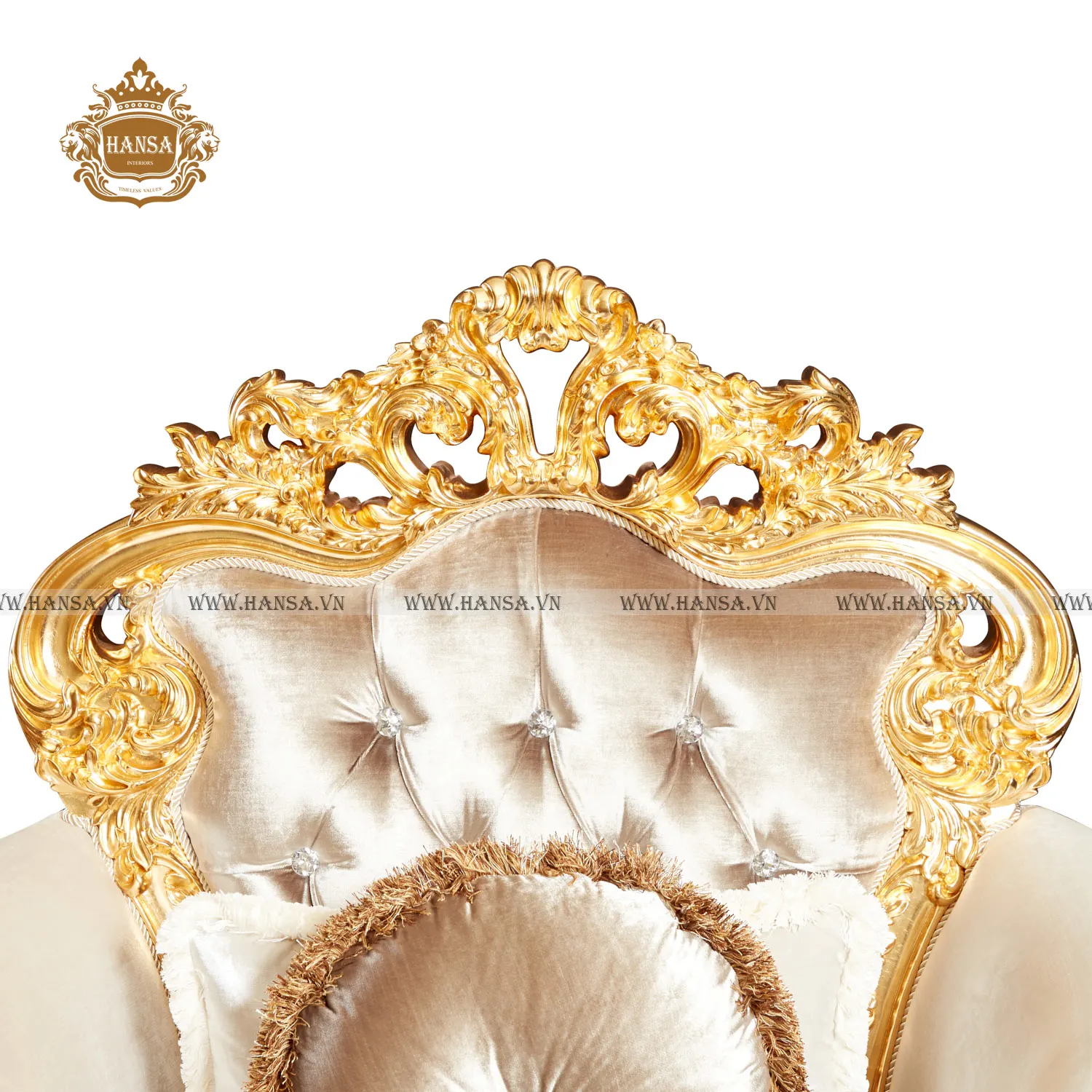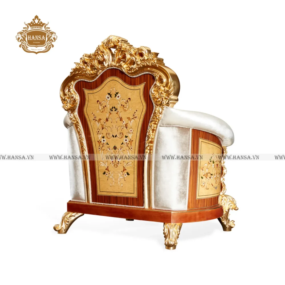 Ghế bành hoàng gia dát vàng cẩn hoa văn là biểu tượng đỉnh cao của sự sang trọng, được thiết kế dành riêng cho những không gian biệt thự và lâu đài đẳng cấp. Sản phẩm gây ấn tượng mạnh mẽ với phần khung gỗ tự nhiên được chạm trổ thủ công tỉ mỉ, bao phủ bởi lớp dát vàng rực rỡ, mang lại vẻ đẹp quyền quý và lộng lẫy.