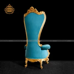 Tựa lưng cao vút, điêu khắc tinh tế, mang lại cảm giác trang trọng như một ngai vàng cá nhân, trong khi các chi tiết trang trí bằng vàng và đệm phụ tròn êm ái đảm bảo sự thoải mái tối đa.