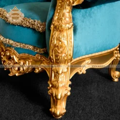 Điểm nhấn nổi bật nhất là chất liệu nhung ngọc bích (teal/turquoise velvet) mềm mại, được tạo hiệu ứng chiều sâu thông qua kỹ thuật chần nút tinh xảo, cùng với các hạt pha lê lấp lánh. Khung ghế là một tuyệt tác chạm khắc thủ công, với các đường cong Rococo uốn lượn, được phủ lớp bọc vàng rực rỡ, tạo nên sự tương phản ngoạn mục.