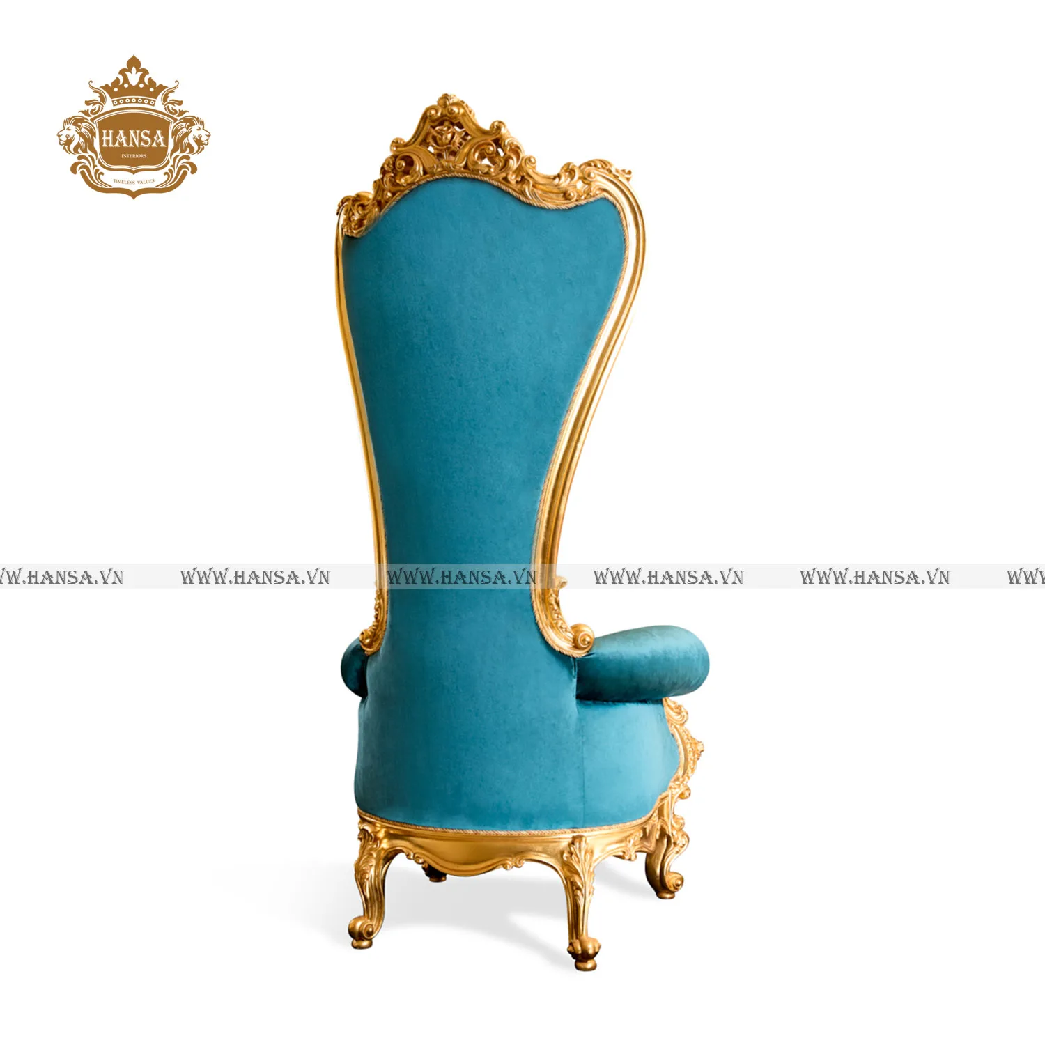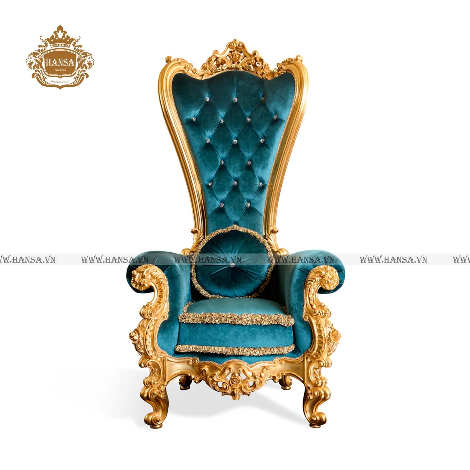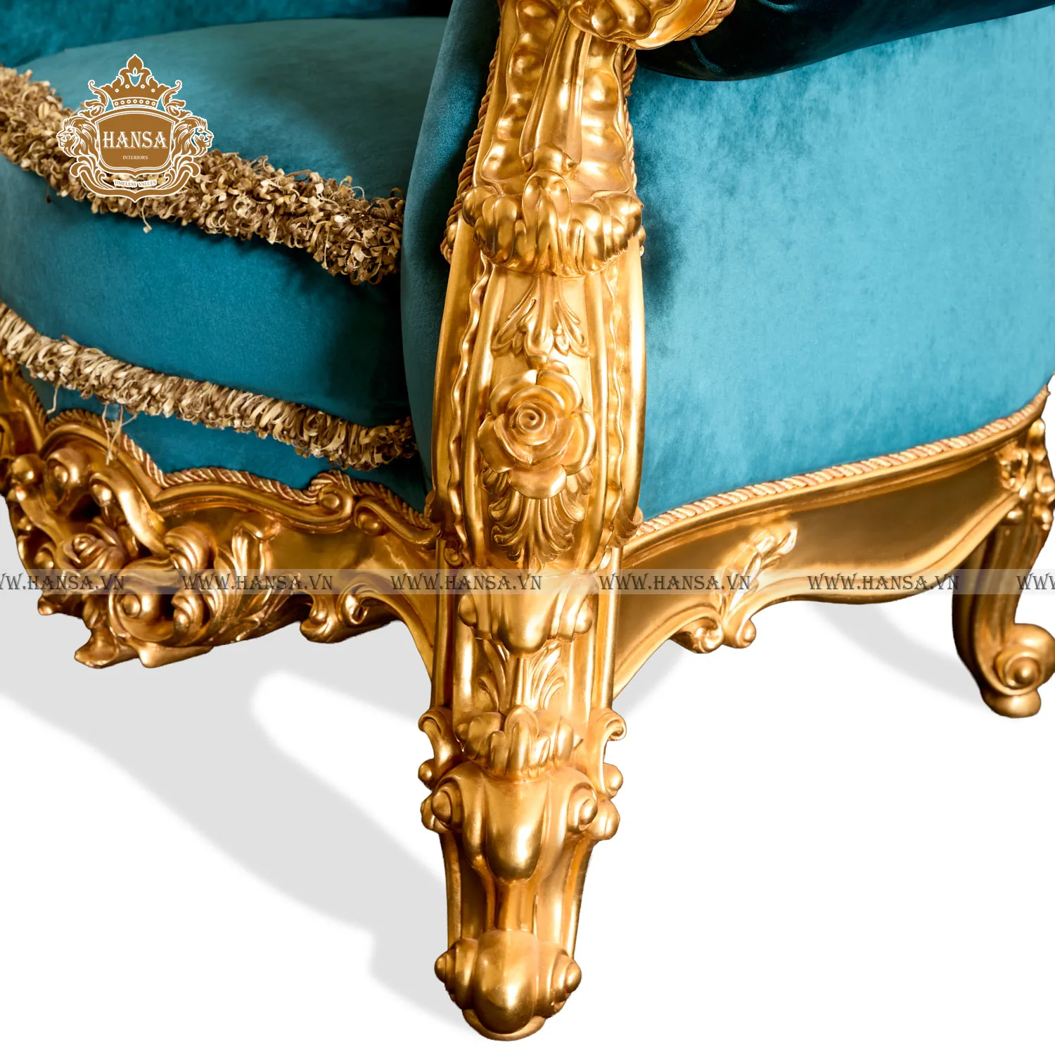 Điểm nhấn nổi bật nhất là chất liệu nhung ngọc bích (teal/turquoise velvet) mềm mại, được tạo hiệu ứng chiều sâu thông qua kỹ thuật chần nút tinh xảo, cùng với các hạt pha lê lấp lánh. Khung ghế là một tuyệt tác chạm khắc thủ công, với các đường cong Rococo uốn lượn, được phủ lớp bọc vàng rực rỡ, tạo nên sự tương phản ngoạn mục. Tựa lưng cao vút, điêu khắc tinh tế, mang lại cảm giác trang trọng như một ngai vàng cá nhân, trong khi các chi tiết trang trí bằng vàng và đệm phụ tròn êm ái đảm bảo sự thoải mái tối đa.