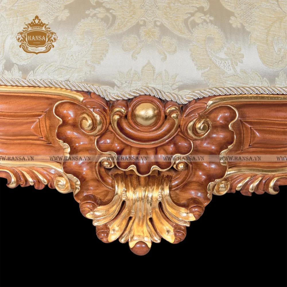 Lòng ghế được bọc bằng chất liệu vải Jacquard Thổ Cẩm cao cấp, với hoa văn dệt nổi tinh tế trên nền kem quý phái, mang lại cảm giác mềm mại và êm ái tuyệt đối. Sự hòa quyện giữa tông màu gỗ nâu trầm ấm, lớp vàng rực rỡ và nền vải sáng màu tạo nên một tổng thể hài hòa, đậm chất nghệ thuật Châu Âu.