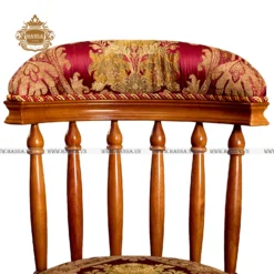 Phần mặt ghế và tựa lưng được bọc vải jacquard cao cấp, với tông màu đỏ đô và vàng rực rỡ của họa tiết damask thịnh hành trong nội thất cung điện. Vòng tròn đỡ chân bằng kim loại mạ đồng hoặc vàng không chỉ cung cấp sự thoải mái mà còn tăng thêm tính thẩm mỹ và sự chắc chắn cho ghế.
