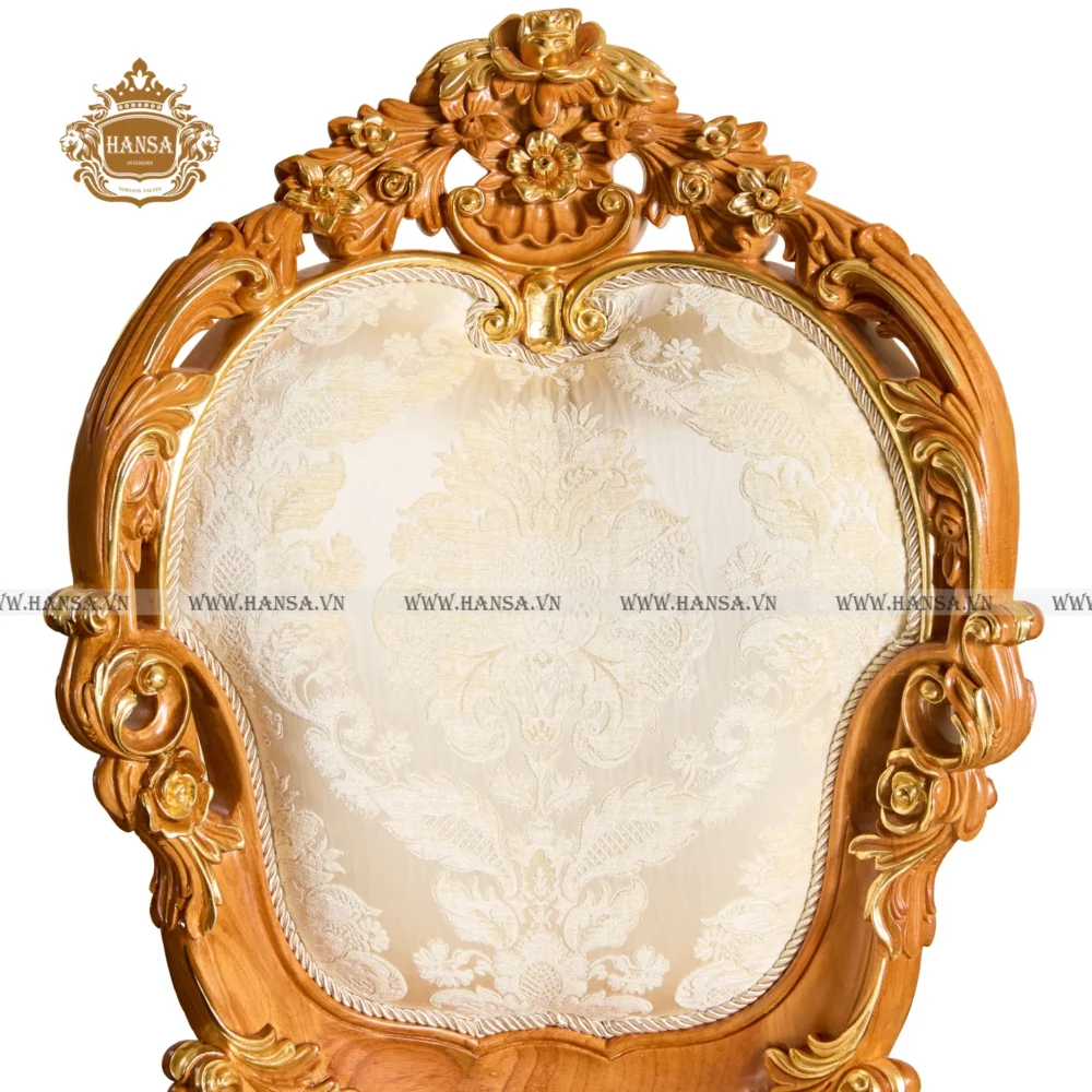 Ghế nổi bật với phần khung gỗ tự nhiên được chế tác công phu, mang tông màu nâu mật ong ấm áp và sang trọng. Toàn bộ lưng ghế và chân ghế được trang trí bằng các chi tiết chạm khắc hoa văn Rococo/Baroque mềm mại, uốn lượn, và được điểm xuyết bằng lớp nhũ vàng lấp lánh, tạo nên vẻ đẹp vương giả đầy cuốn hút.