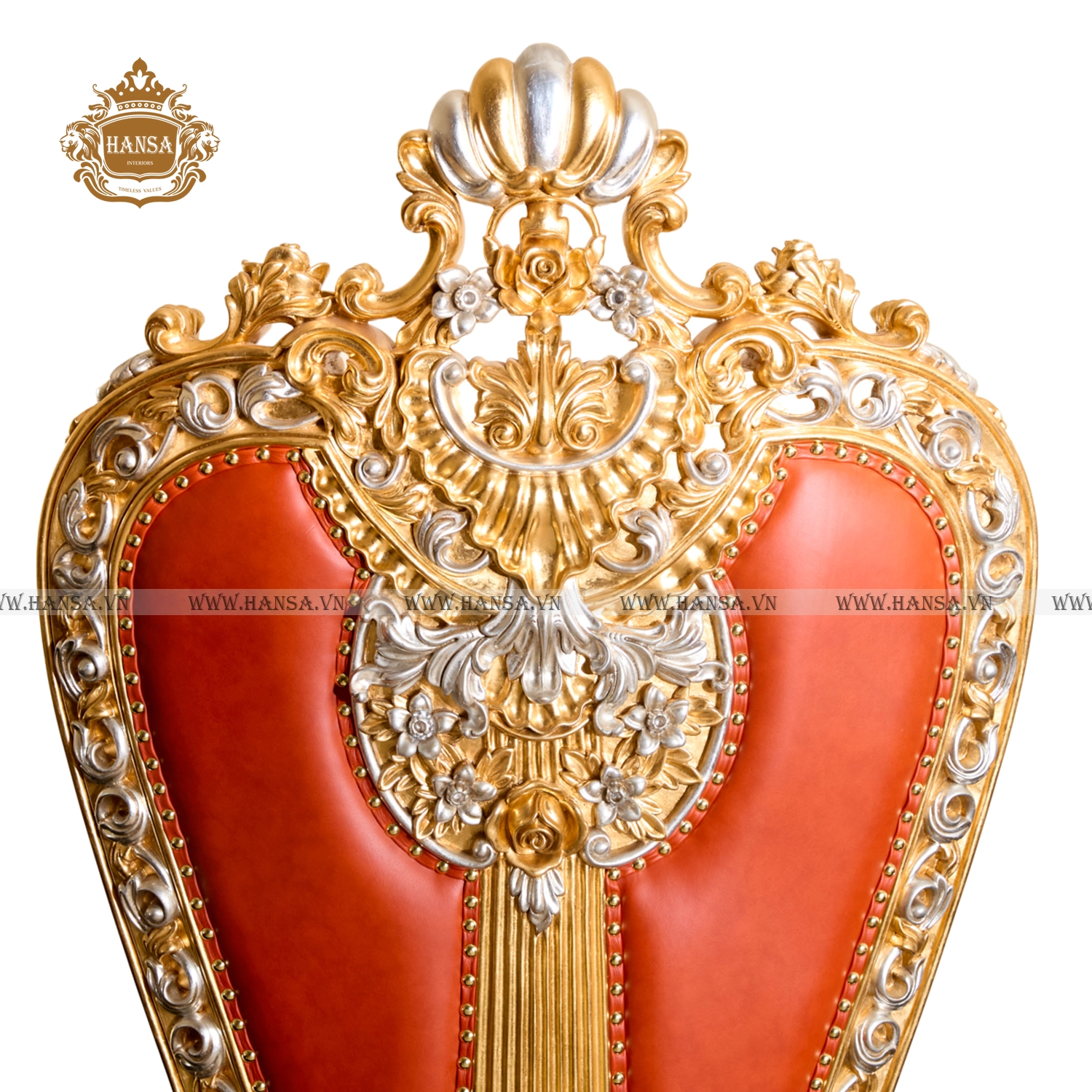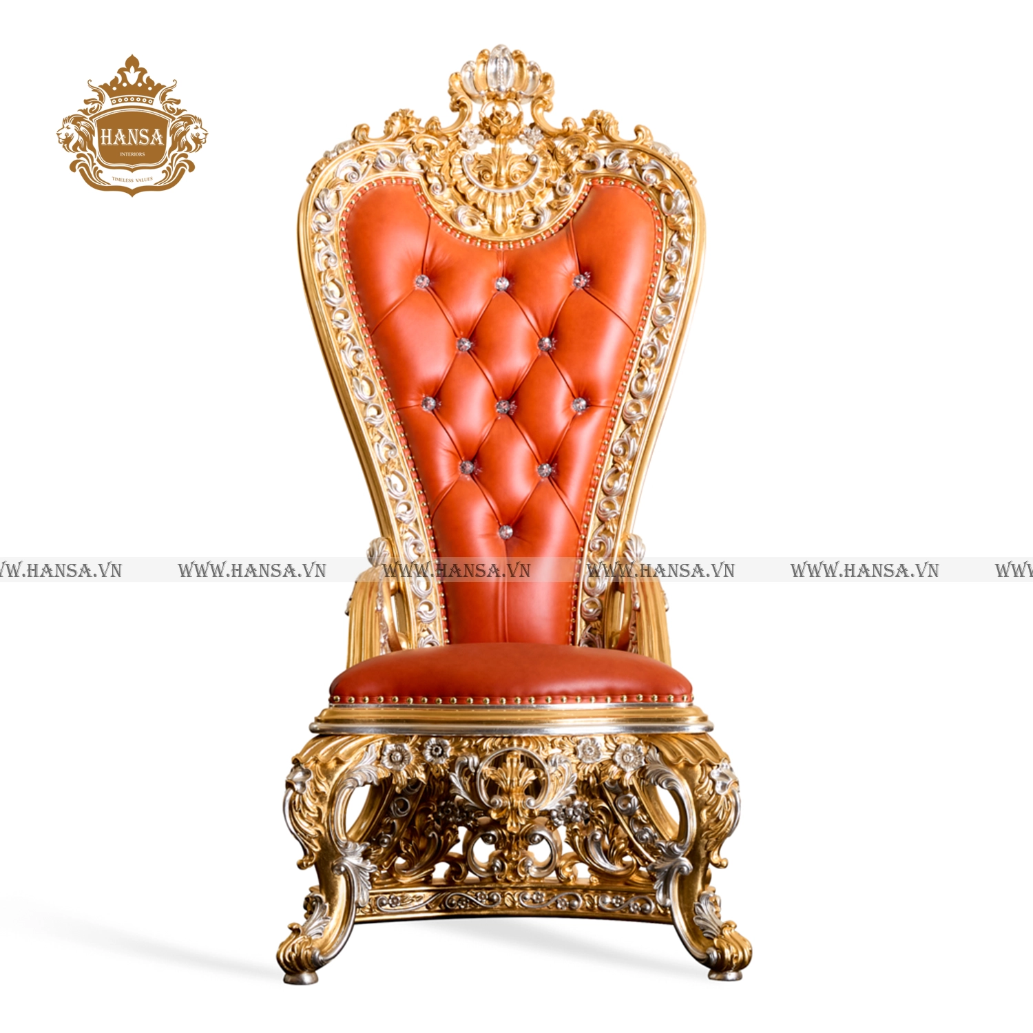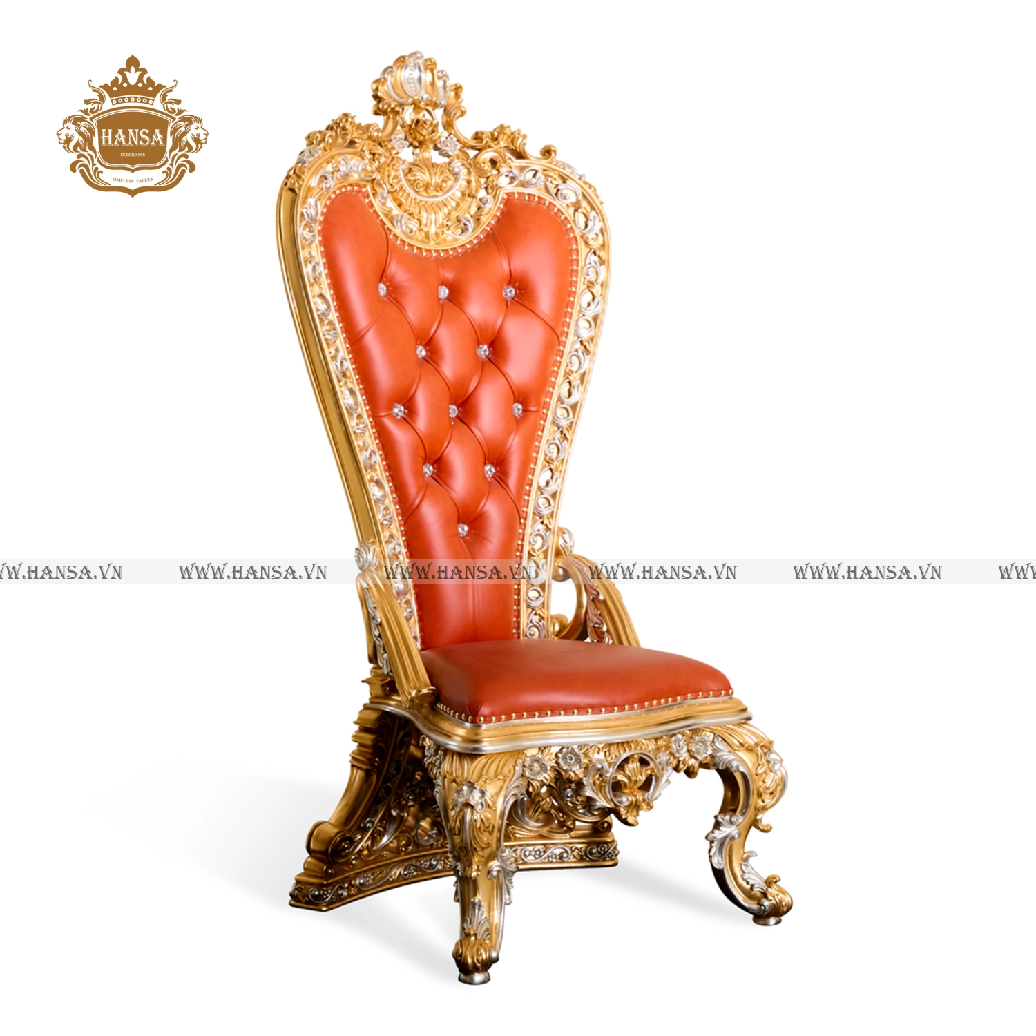Phần lưng ghế cao vút, bọc bằng da bò tót thượng hạng màu cam cháy, được chần nút sâu và đính các hạt pha lê Swarovski lấp lánh, mang lại sự êm ái tuyệt đối và vẻ ngoài kiêu sa. Chân ghế vững chãi, cũng được chạm khắc và dát vàng đồng bộ, hoàn thiện vẻ đẹp hoàng gia của sản phẩm.