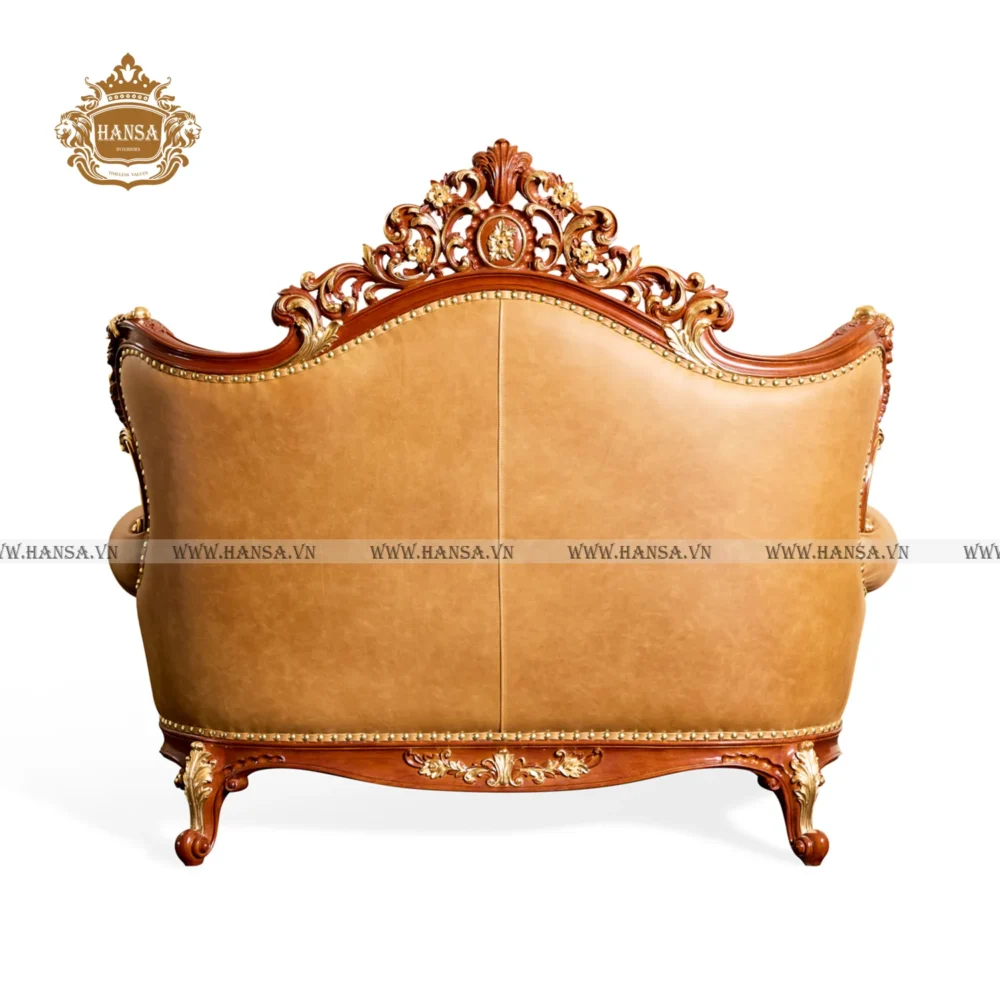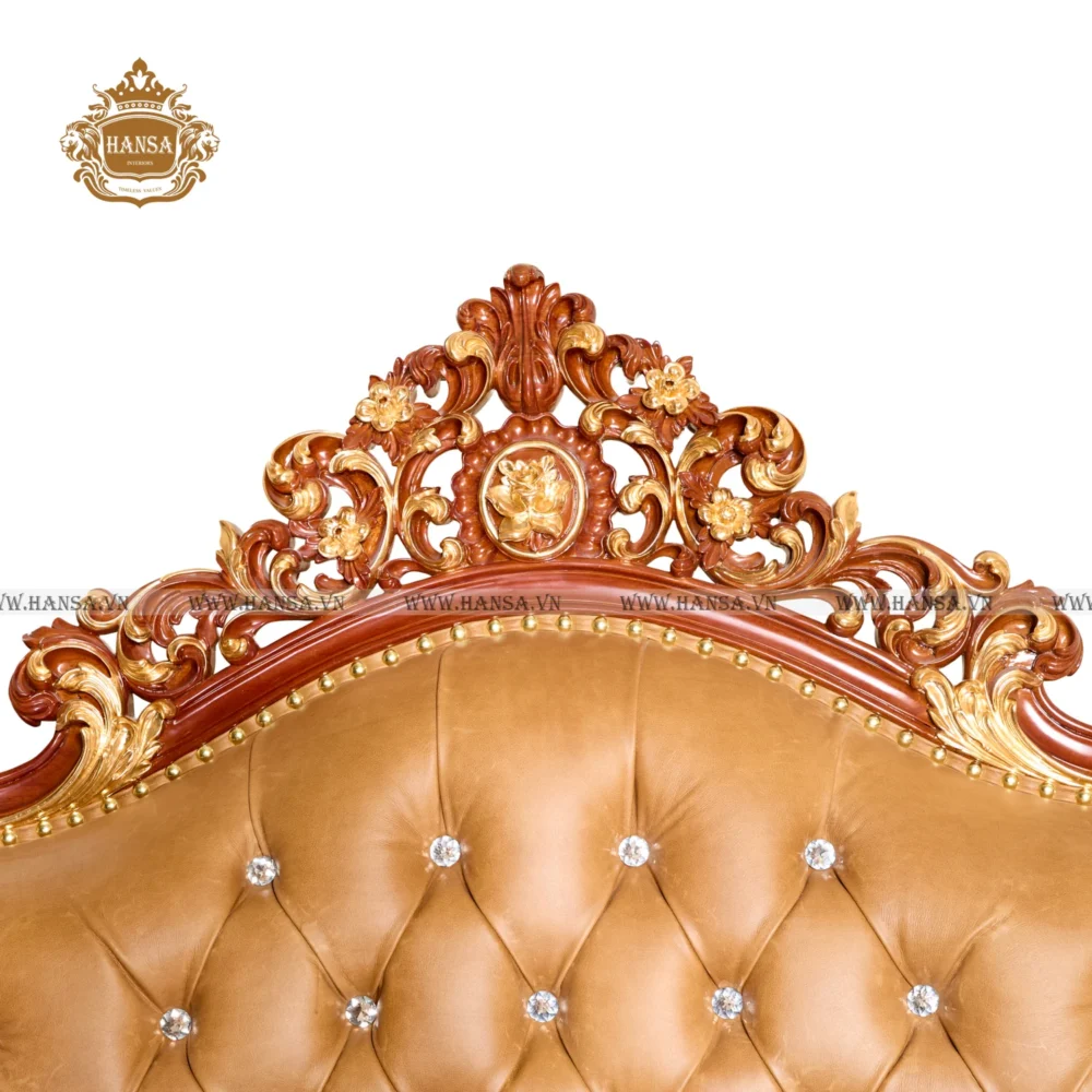 Khung ghế được chế tác từ gỗ gõ đỏ tự nhiên, với những đường nét chạm khắc uốn lượn, tinh xảo, được phủ lớp sơn bóng và điểm xuyết các chi tiết nhũ vàng lấp lánh, tái hiện vẻ đẹp vương giả của phong cách hoàng gia. Những chân ghế chắc chắn, được chạm khắc tinh xảo không kém, nâng đỡ toàn bộ kết cấu, mang lại sự vững chãi và an tâm.