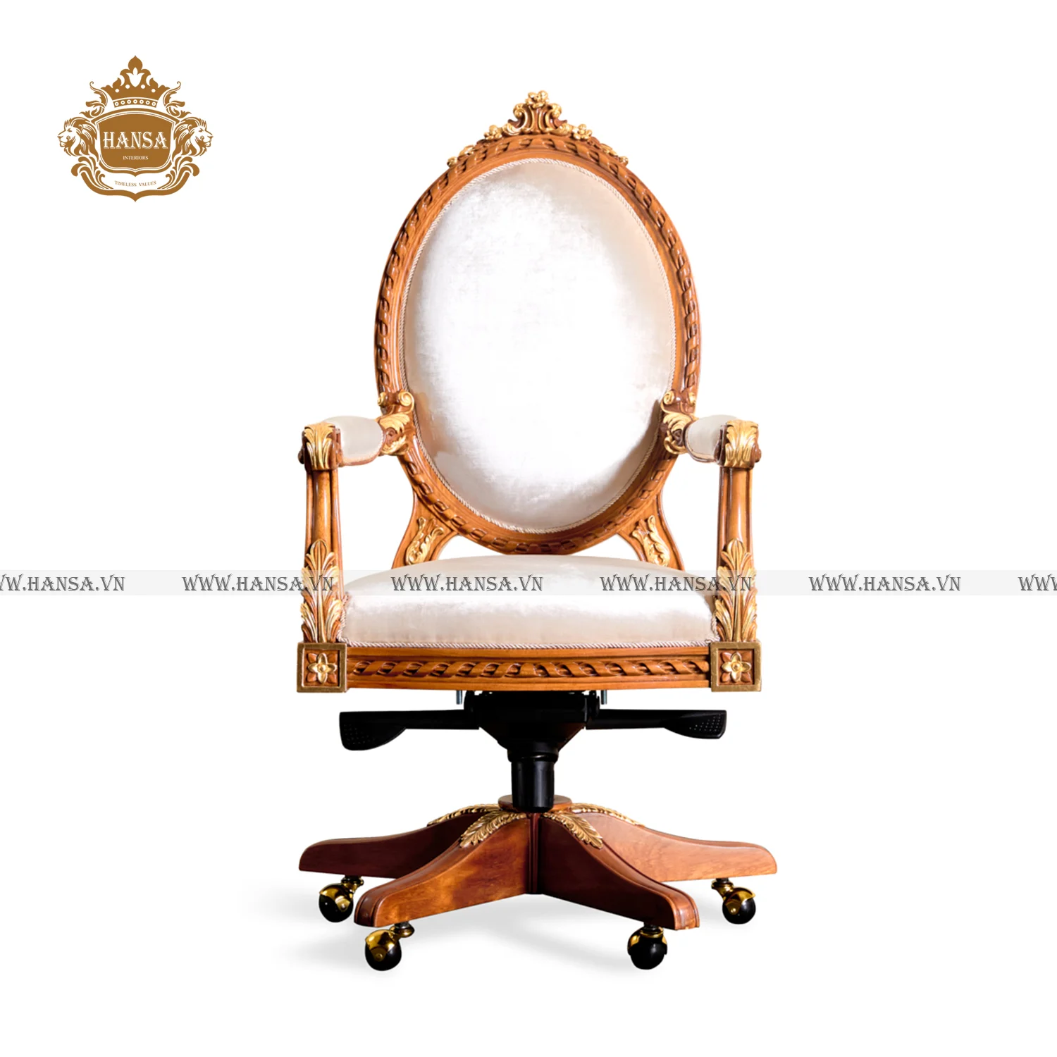 Đánh dấu sự khác biệt trong không gian làm việc của bạn với chiếc ghế xoay gỗ chạm khắc bọc nhung. Đây không chỉ là một chiếc ghế văn phòng, mà là một tuyên ngôn về phong cách, đặt sự uy nghi của nội thất cổ điển lên trên tính năng động của hiện đại.