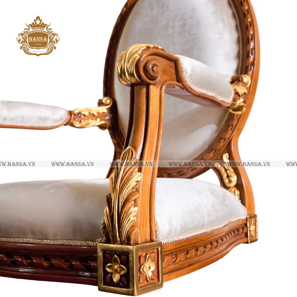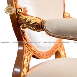 Điểm sáng giá nhất là các chi tiết chạm khắc thủ công tinh xảo chạy dọc theo viền lưng ghế, tay vịn và chân ghế. Các họa tiết lá cuộn, hoa văn rococo được điểm xuyết bằng lớp nhũ vàng tinh tế, gợi nhớ đến những cung điện xa hoa.
