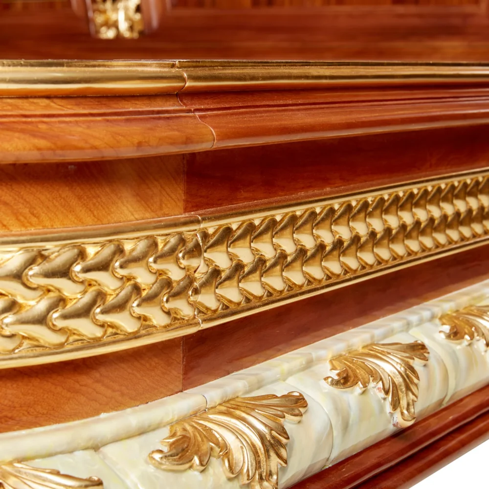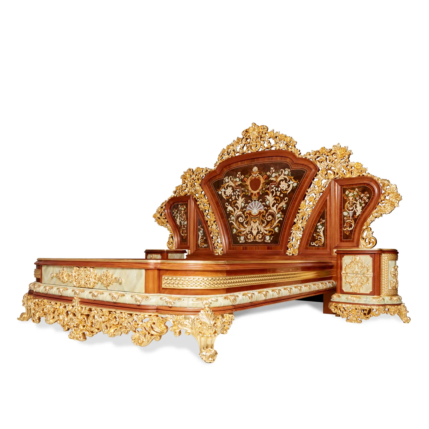 Toàn bộ khung giường được chế tác từ gỗ gõ đỏ nguyên khối, loại gỗ danh tiếng về độ bền và sự ổn định. Bao quanh những bức họa veneer là hệ thống hoa văn lá tây chạm khắc nổi, được dát vàng thủ công rực rỡ, tạo nên sự tương phản sang trọng trên nền gỗ ấm áp.