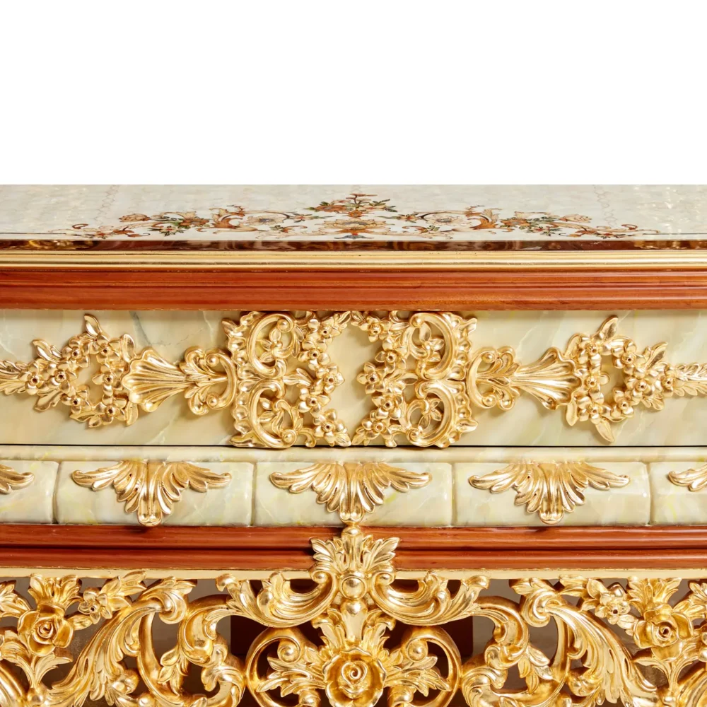 Sự kết hợp độc đáo giữa mặt đá cẩm thạch khảm ở đuôi giường và các chi tiết dát vàng chạy dọc thân giường không chỉ khẳng định vị thế của gia chủ mà còn biến không gian nghỉ ngơi thành một căn phòng ngủ hoàng gia đúng nghĩa. Đây là lựa chọn hoàn hảo cho những chủ nhân yêu thích vẻ đẹp của những giá trị thủ công di sản và sự bề thế, trường tồn.