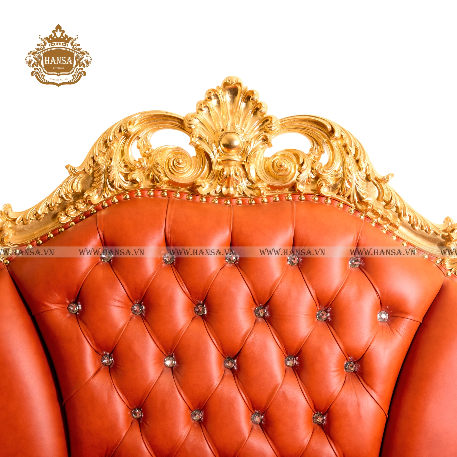 Phần đệm ngồi và tựa lưng cao được bọc bằng chất liệu da cao cấp với kỹ thuật chần nút sâu, đính các hạt trang trí lấp lánh, mang lại sự thoải mái tối đa và vẻ ngoài kiêu sa. Chân ghế được tạo hình cong mềm mại, chạm khắc vàng tinh xảo, giữ vững sự vững chắc mà không làm mất đi nét duyên dáng.