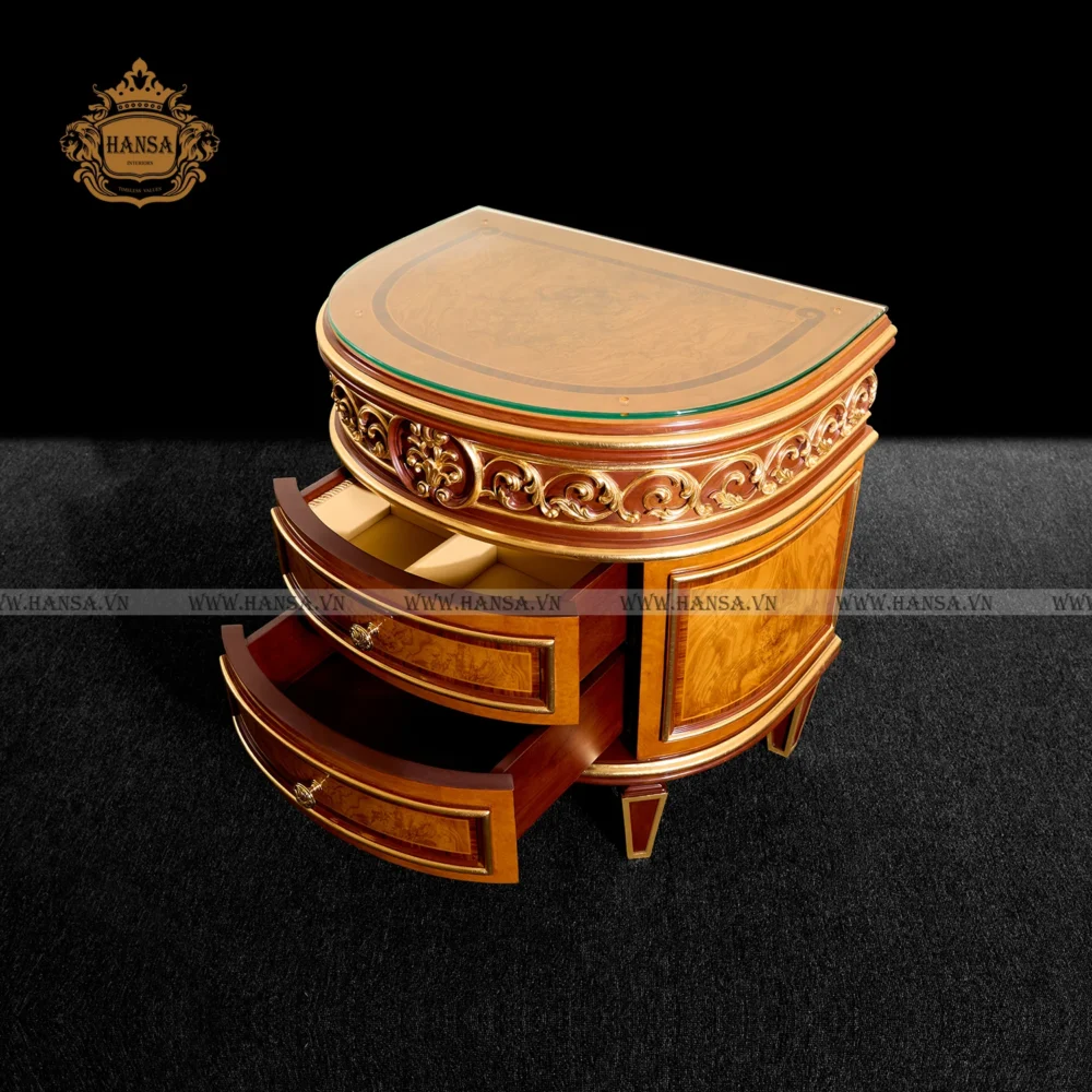 Tủ đầu giường bán nguyệt dát vàng là món đồ nội thất không thể thiếu trong phòng ngủ phong cách tân cổ điển hoặc cổ điển, nơi sự tinh tế, kỹ thuật chế tác thủ công và nét quý phái hòa quyện để nâng tầm không gian riêng tư của bạn.