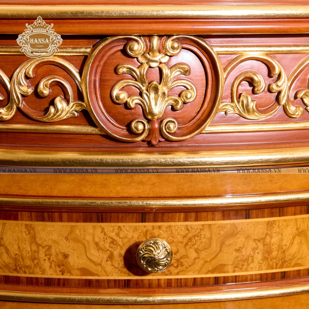 Điểm nhấn tuyệt đối của sản phẩm là những chi tiết trang trí được chạm khắc tinh xảo và phủ lớp dát vàng sáng chói. Những họa tiết hoa văn uốn lượn, mang âm hưởng Rococo, chạy dọc theo phần yếm tủ, tạo nên sự tương phản ngoạn mục với lớp sơn bóng hoặc vân gỗ ấm áp của thân tủ.