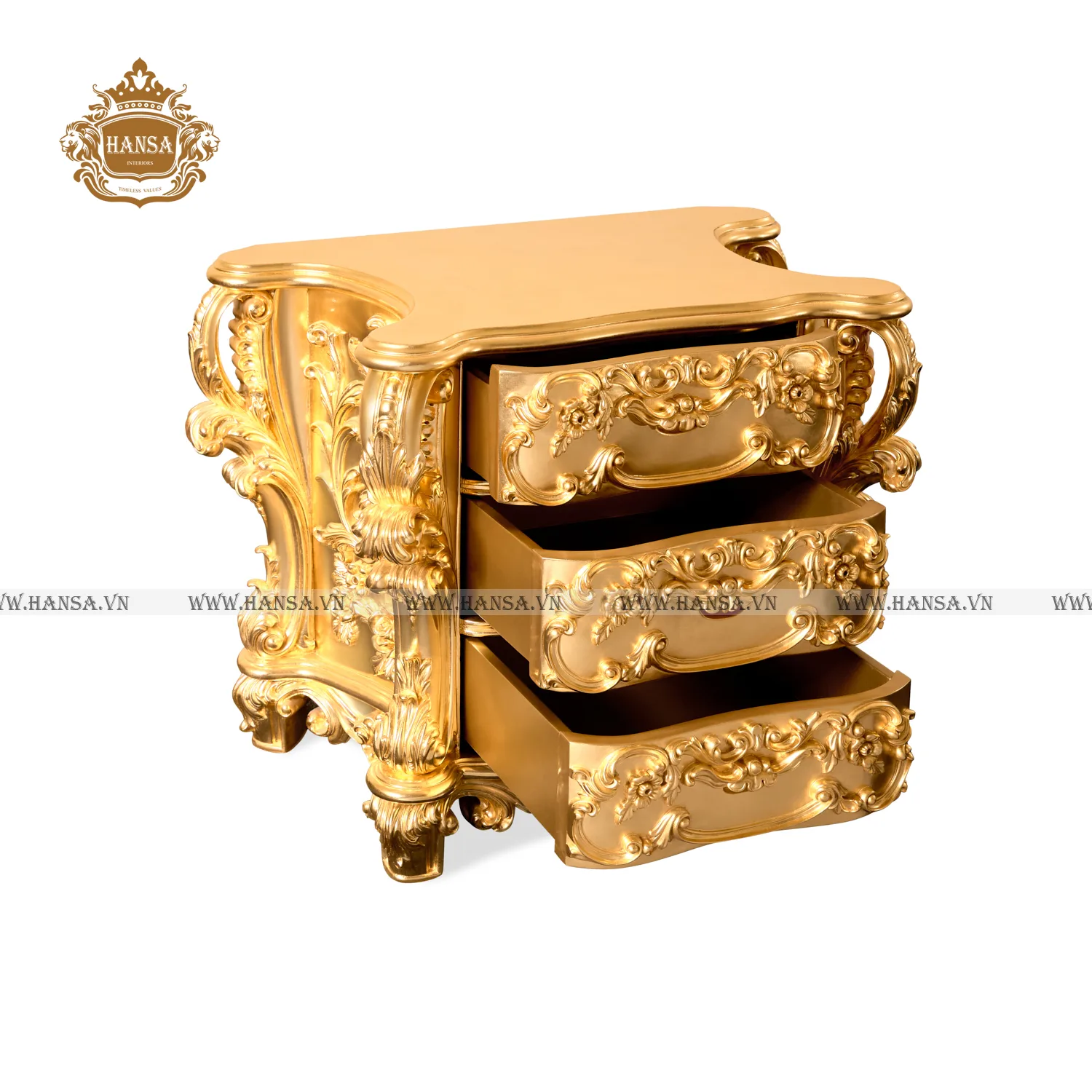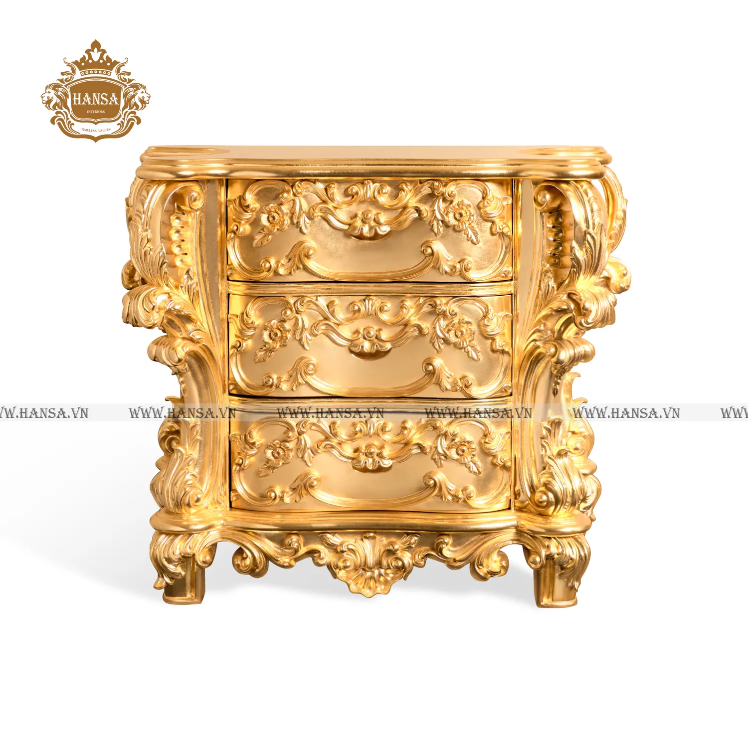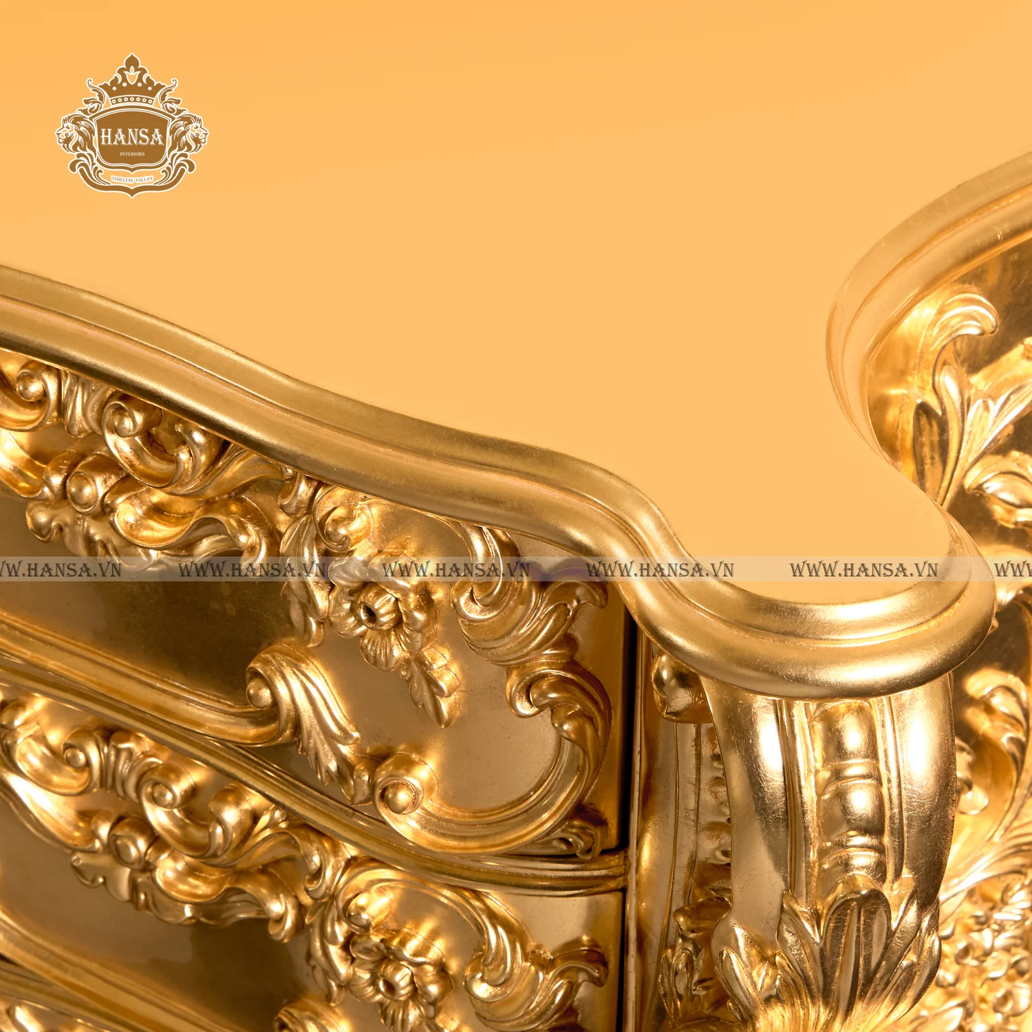 Chiếc tủ được chế tác từ chất liệu gỗ cao cấp, sau đó được phủ lớp sơn vàng óng ánh, mô phỏng kỹ thuật dát vàng truyền thống. Toàn bộ thân tủ, từ mặt bên, chân đế cho đến ba ngăn kéo tiện dụng, đều được các nghệ nhân chạm khắc tỉ mỉ các hoa văn cuộn sóng, lá cành và hoa phức tạp, tạo nên cảm giác chuyển động và sự vương giả khó cưỡng.