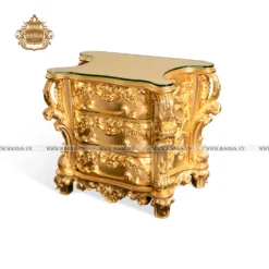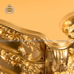 Tủ đầu giường chạm khắc dát vàng là một tuyệt tác nội thất, mang đến sự xa hoa và lộng lẫy tuyệt đối cho không gian phòng ngủ theo phong cách Hoàng gia hoặc Baroque. Thoát khỏi những thiết kế đơn giản, sản phẩm này là một bức điêu khắc sống động với mọi bề mặt đều được phủ kín bằng các họa tiết trang trí phức tạp.