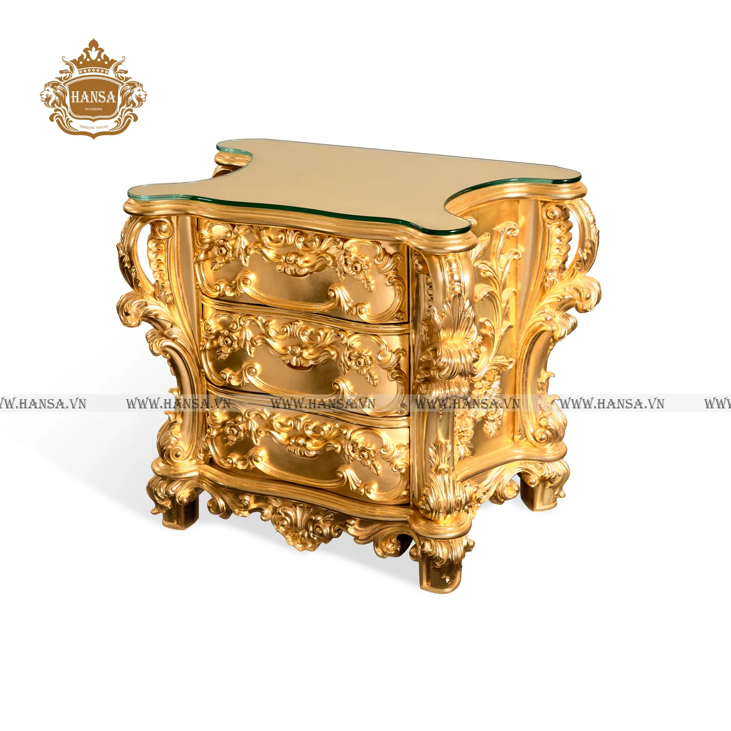 Mặt tủ được trang bị một tấm kính cường lực trong suốt, không chỉ bảo vệ bề mặt chạm khắc mà còn tạo sự phản chiếu ánh sáng, làm tăng thêm độ lấp lánh của màu vàng kim. Ba ngăn kéo với tay nắm ẩn và đường ray trượt êm ái, cung cấp không gian lưu trữ kín đáo, giúp bạn giữ gọn gàng các vật dụng cá nhân.