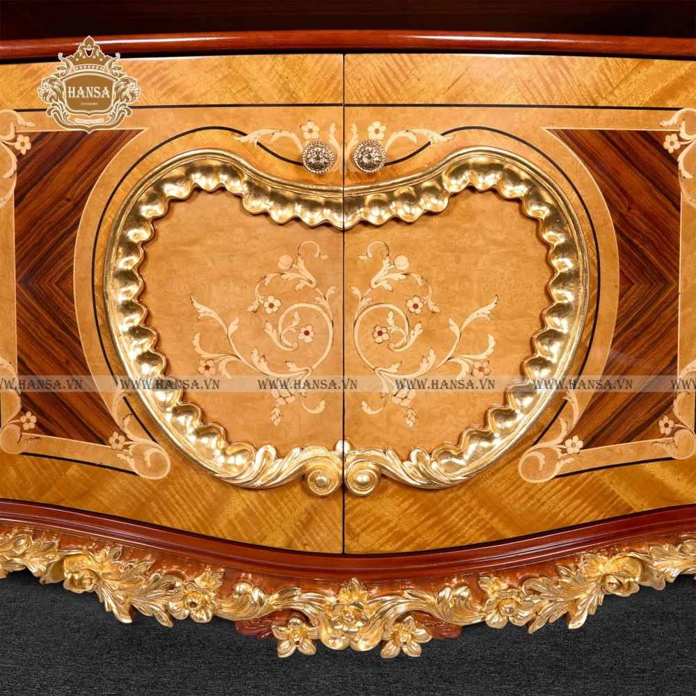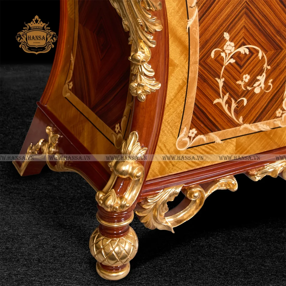 Tủ được chế tác từ Gỗ Gõ Đỏ nguyên khối thượng hạng, nổi bật với sự vững chãi và màu sắc ấm áp, tạo nên nền tảng hoàn hảo cho nghệ thuật. Điểm nhấn độc đáo nhất chính là kỹ thuật Marquetry (khảm gỗ) thủ công truyền thống. Những lát gỗ quý hiếm được cắt ghép tỉ mỉ, tạo nên các hoa văn đối xứng, mềm mại, đặc biệt là hình dáng cong và họa tiết lãng mạn ở mặt trước, thể hiện sự khéo léo tuyệt đỉnh của người thợ.